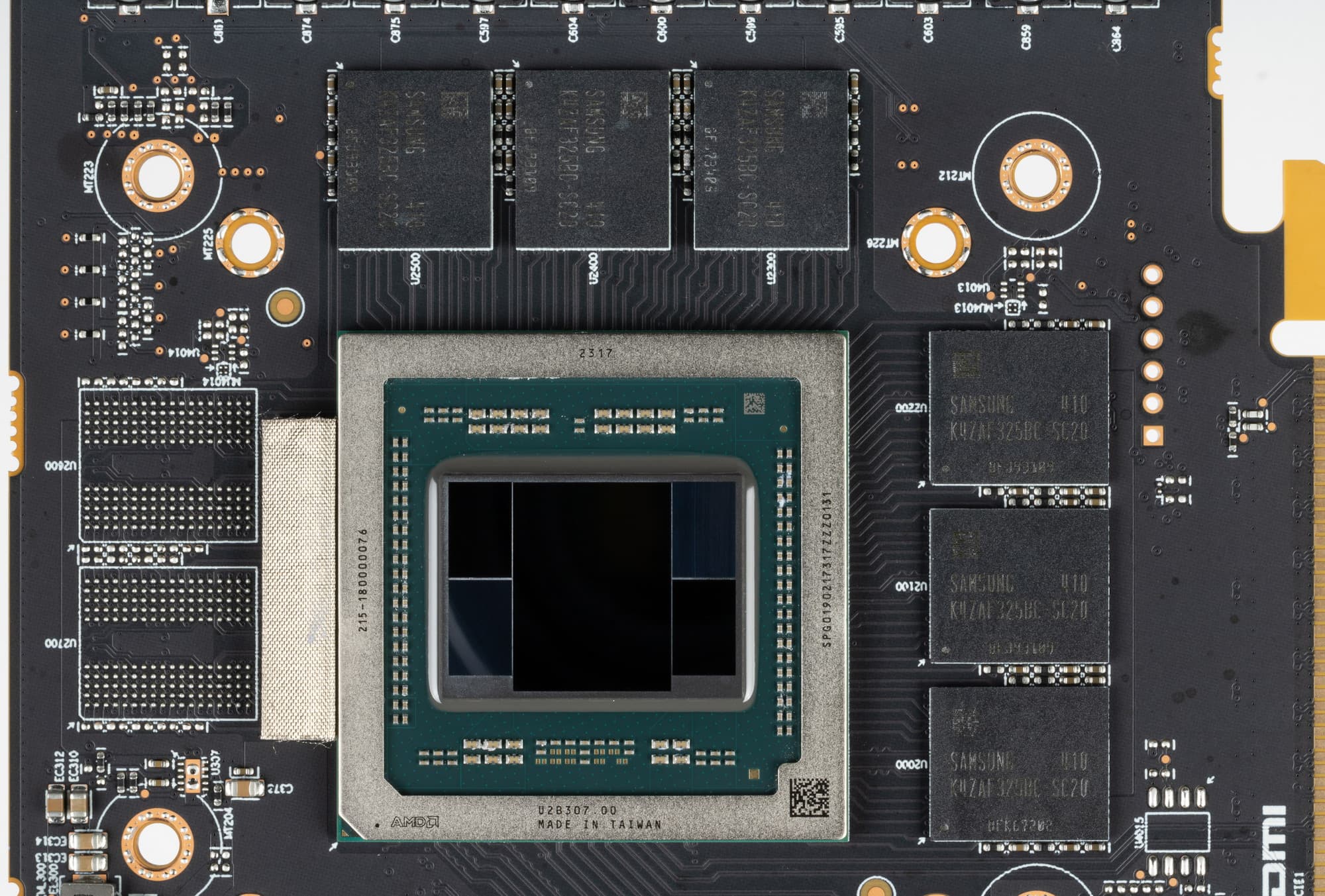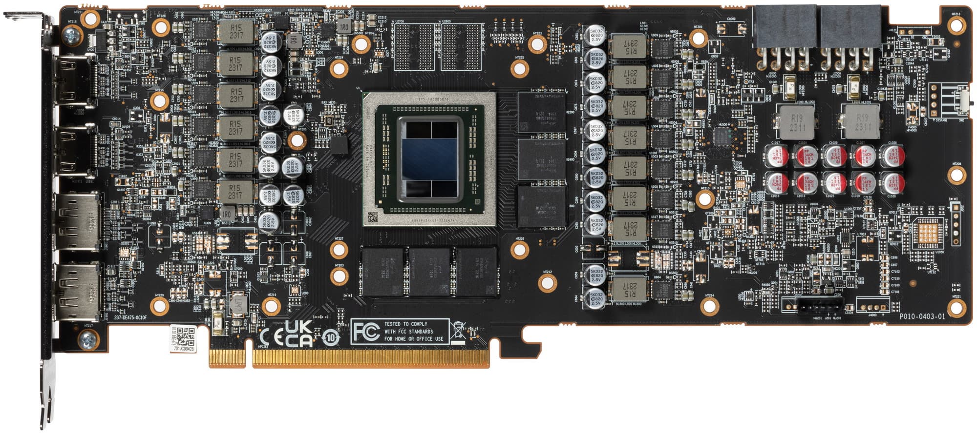 Мы сравниваем PCB карты Acer с картой другого производителя (референс-карт на базе Radeon RX 7700 XT нет). PCB очень похожи, и очевидно, что обе печатные платы основаны на эталонном дизайне AMD. Даже системы питания у них практически идентичны за исключением деталей. PCB содержит разведенную шину обмена с памятью в 256 бит и предназначена для Radeon RX 7800 XT c 16 ГБ памяти. На данной плате просто отсутствует пара микросхем памяти, вследствие чего шина превратилась в 192-битную, а объем видеопамяти уменьшился с 16 до 12 ГБ.