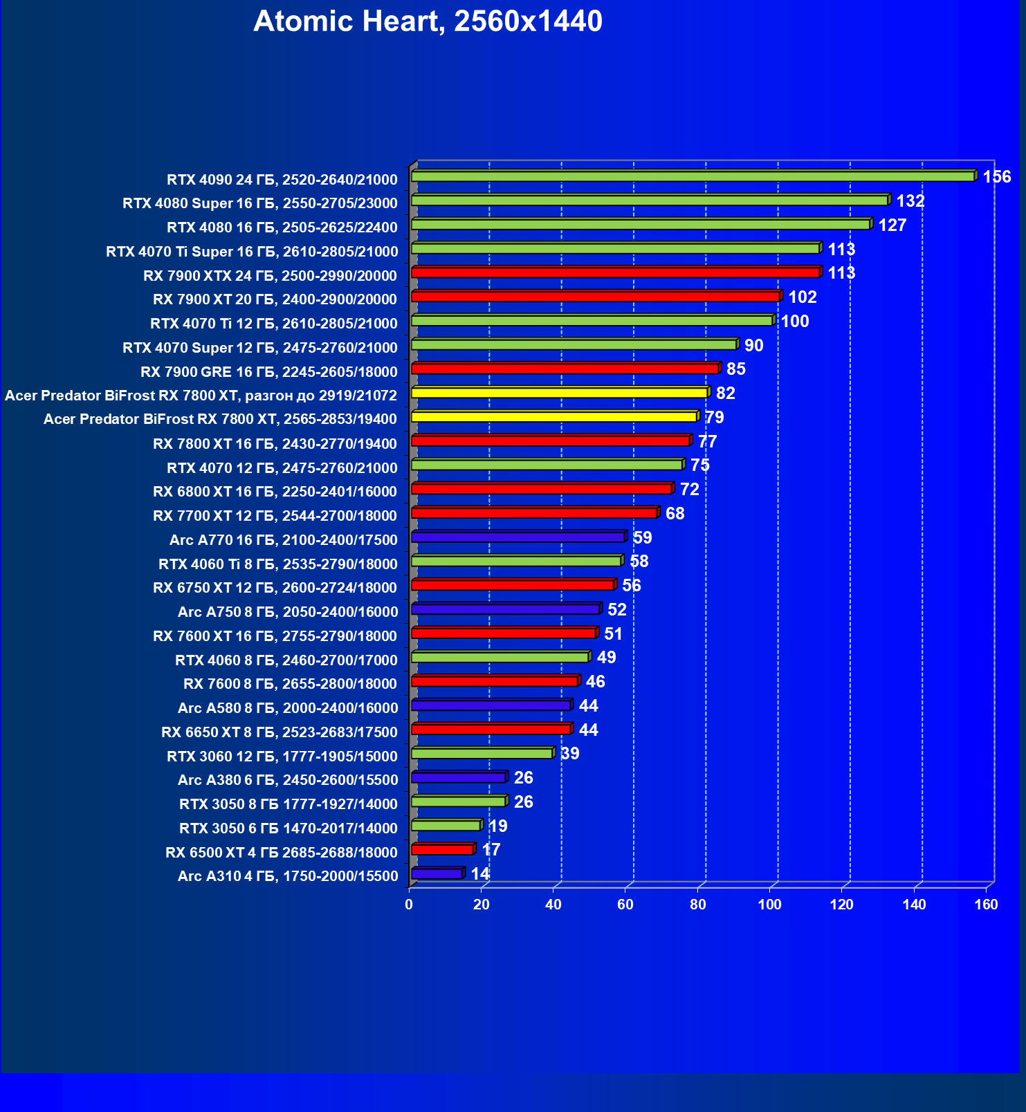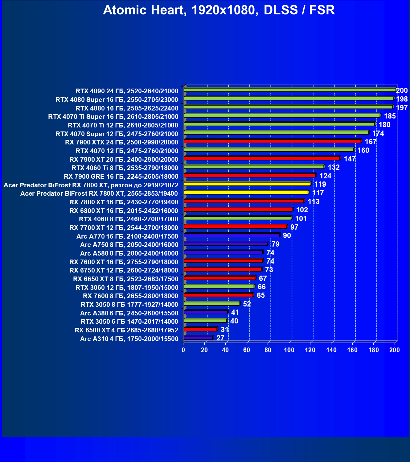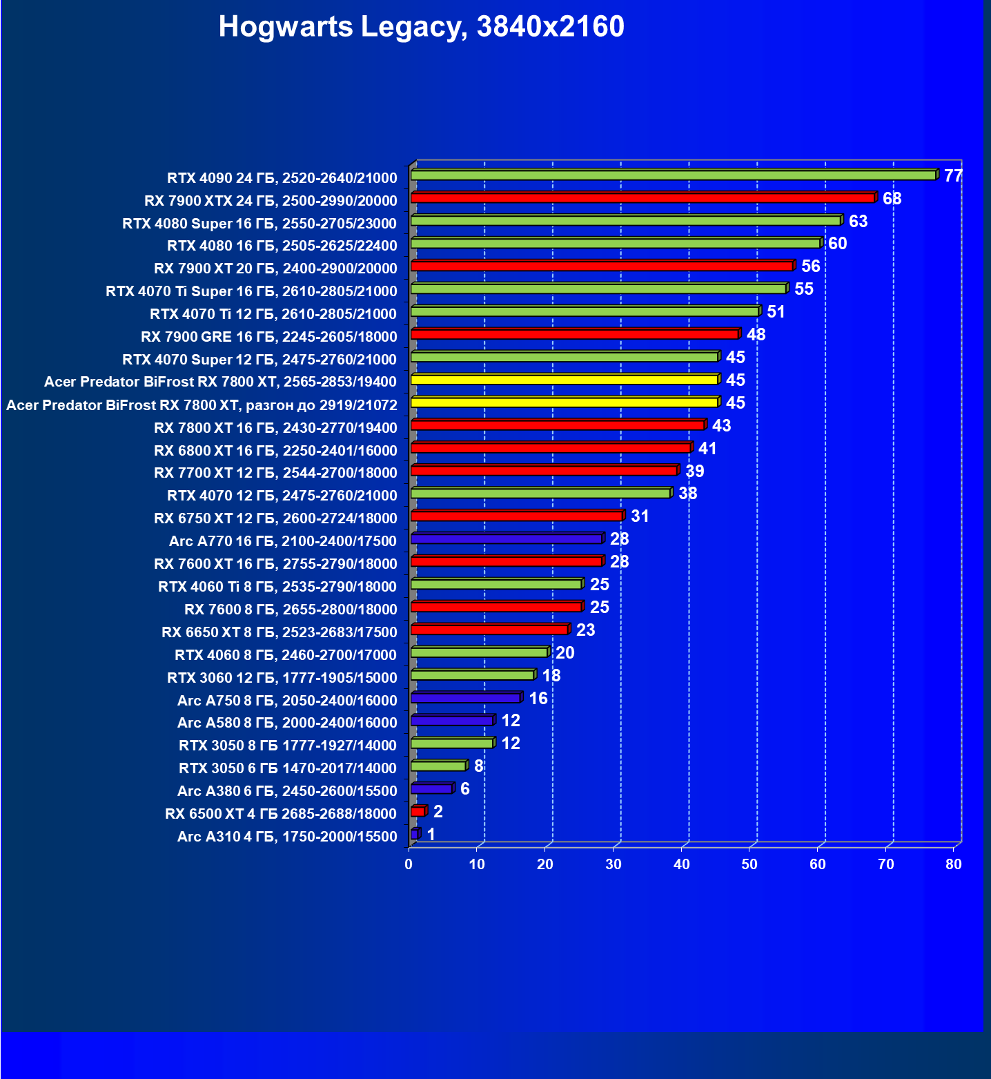 | 11 | Acer Predator BiFrost RX 7800 XT, 2565—2853/19400 | 1288 | 226 | 57 000 |