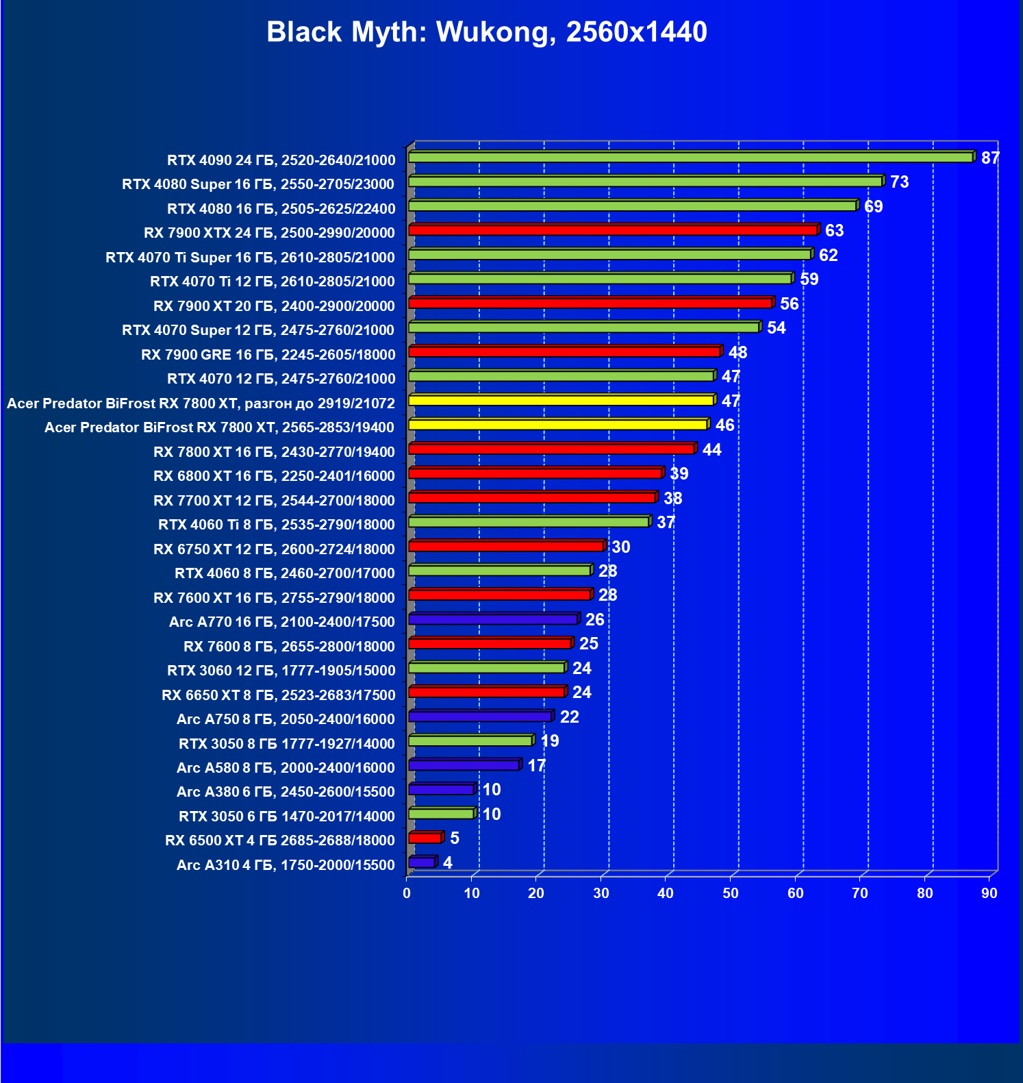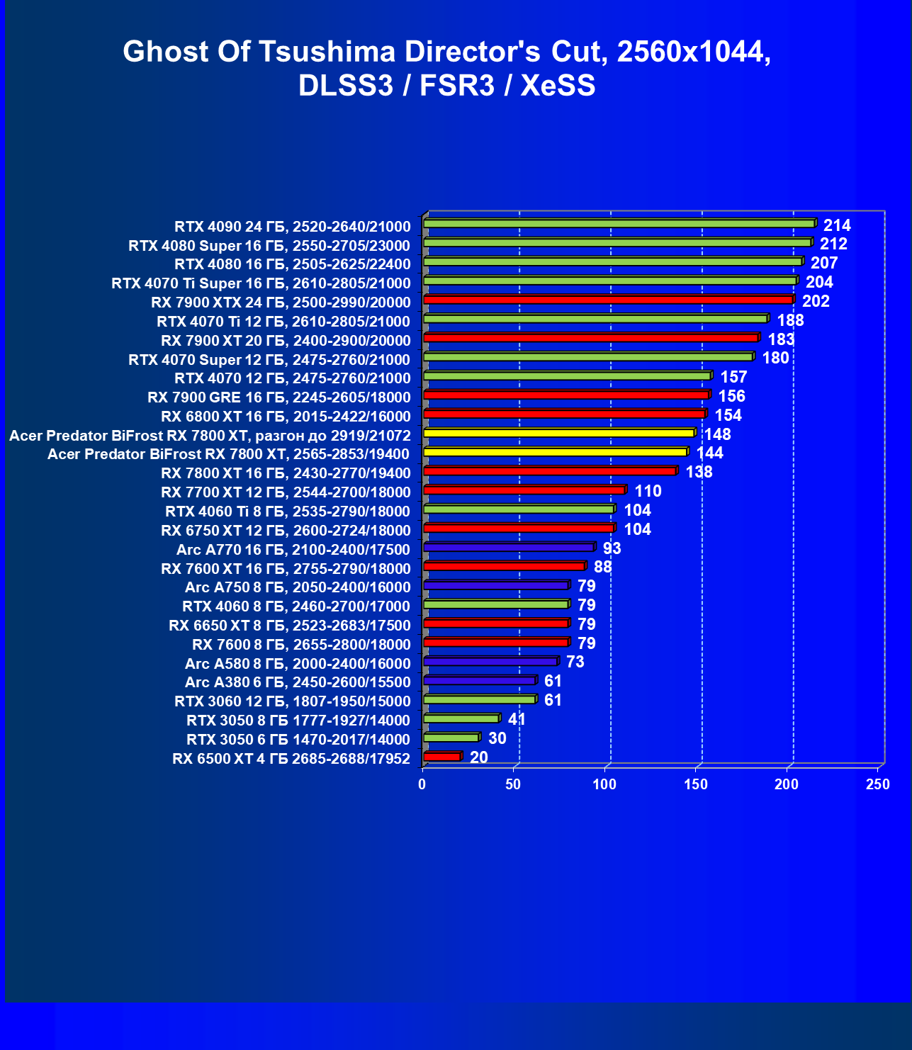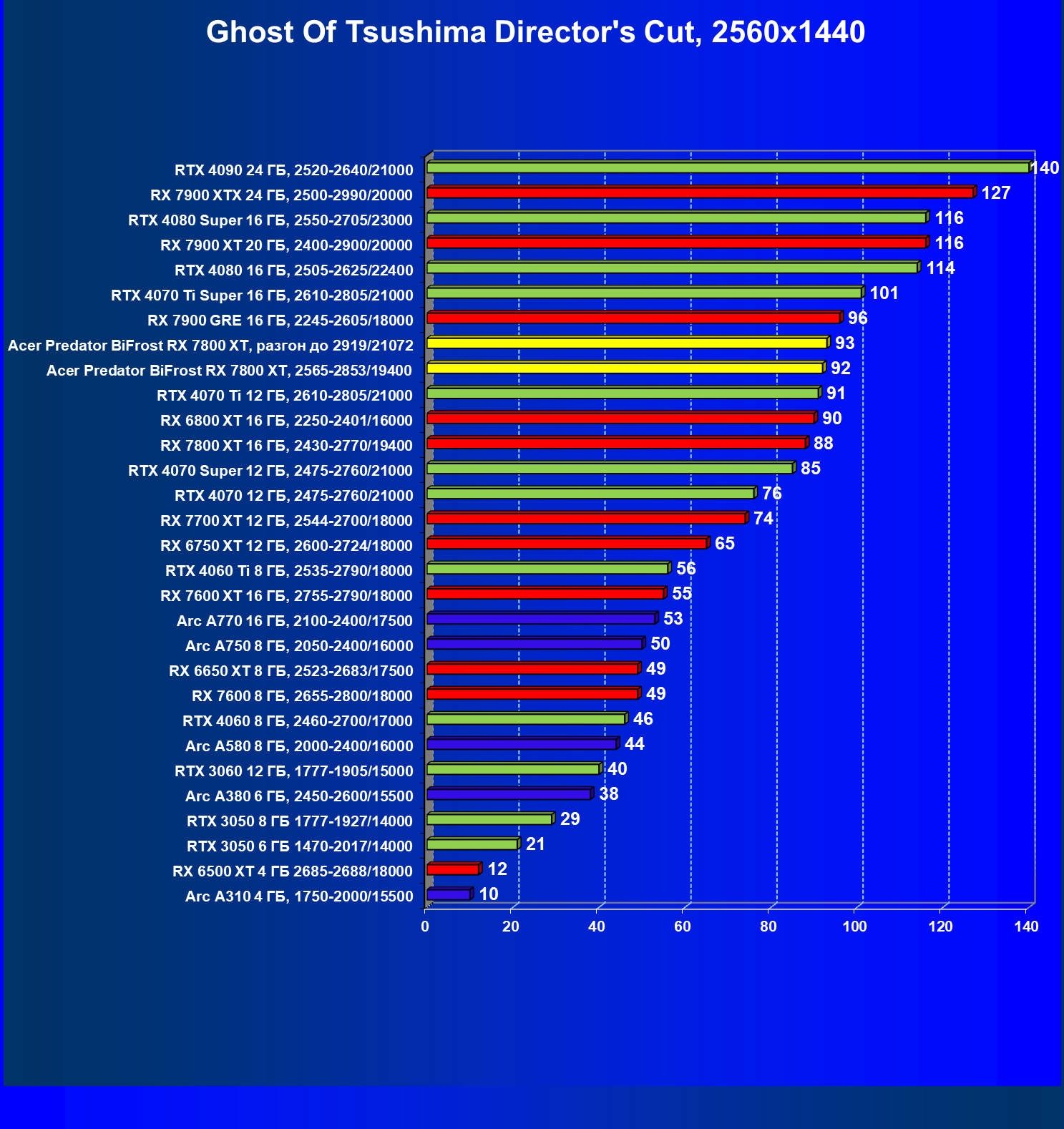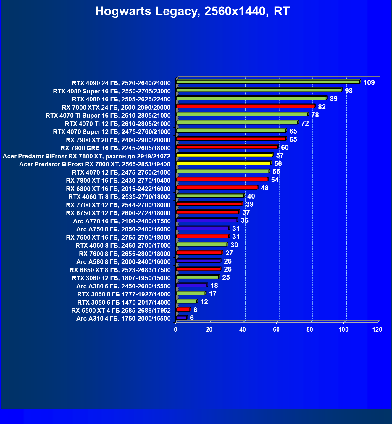 | 11 | Acer Predator BiFrost RX 7800 XT, 2565—2853/19400 | 1288 | 226 | 57 000 |