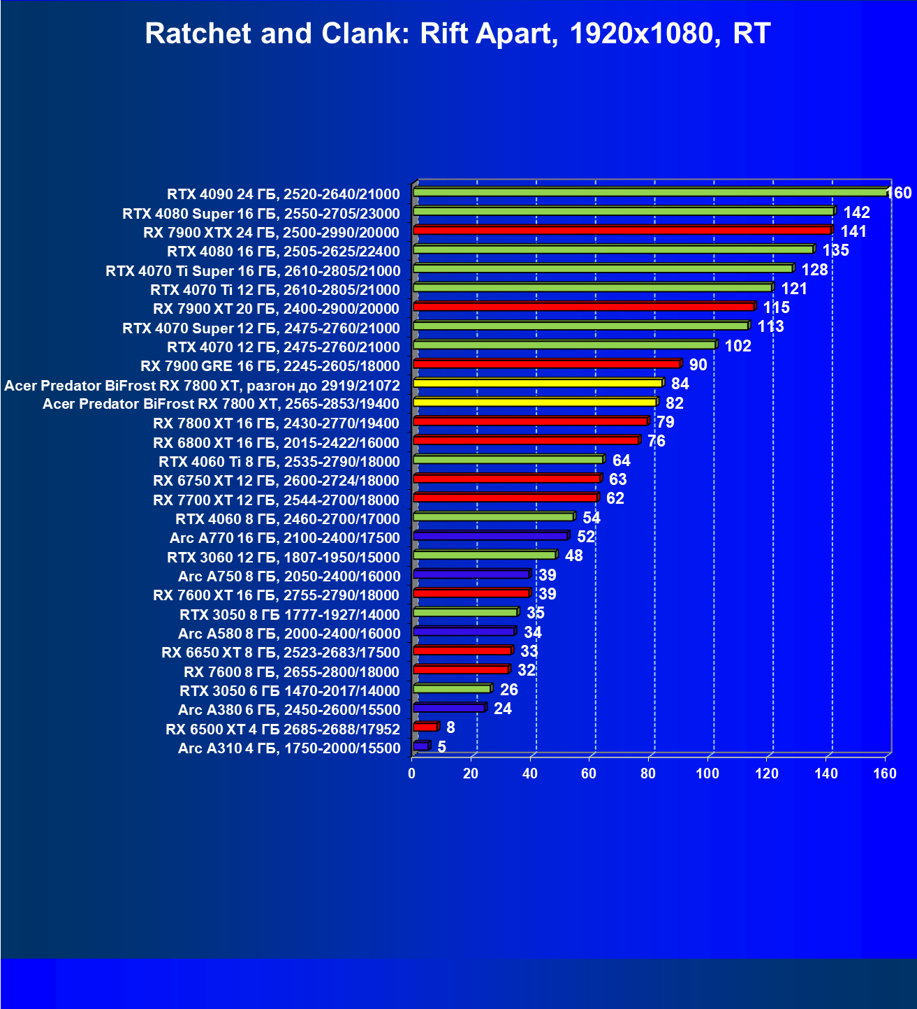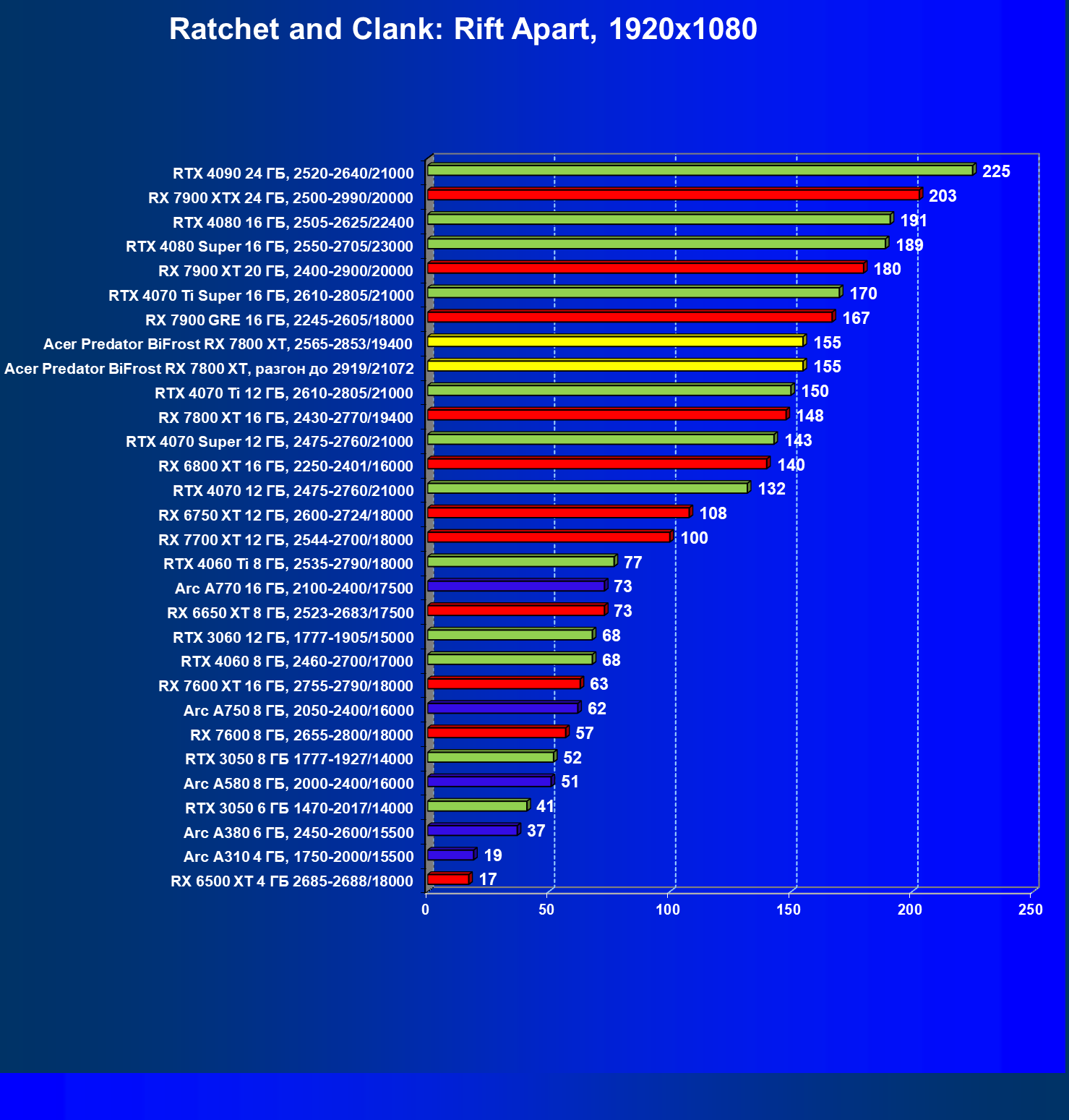 | 02 | Acer Predator BiFrost RX 7800 XT, разгон до 2919/21072 | 229 | 1307 | 57 000 |