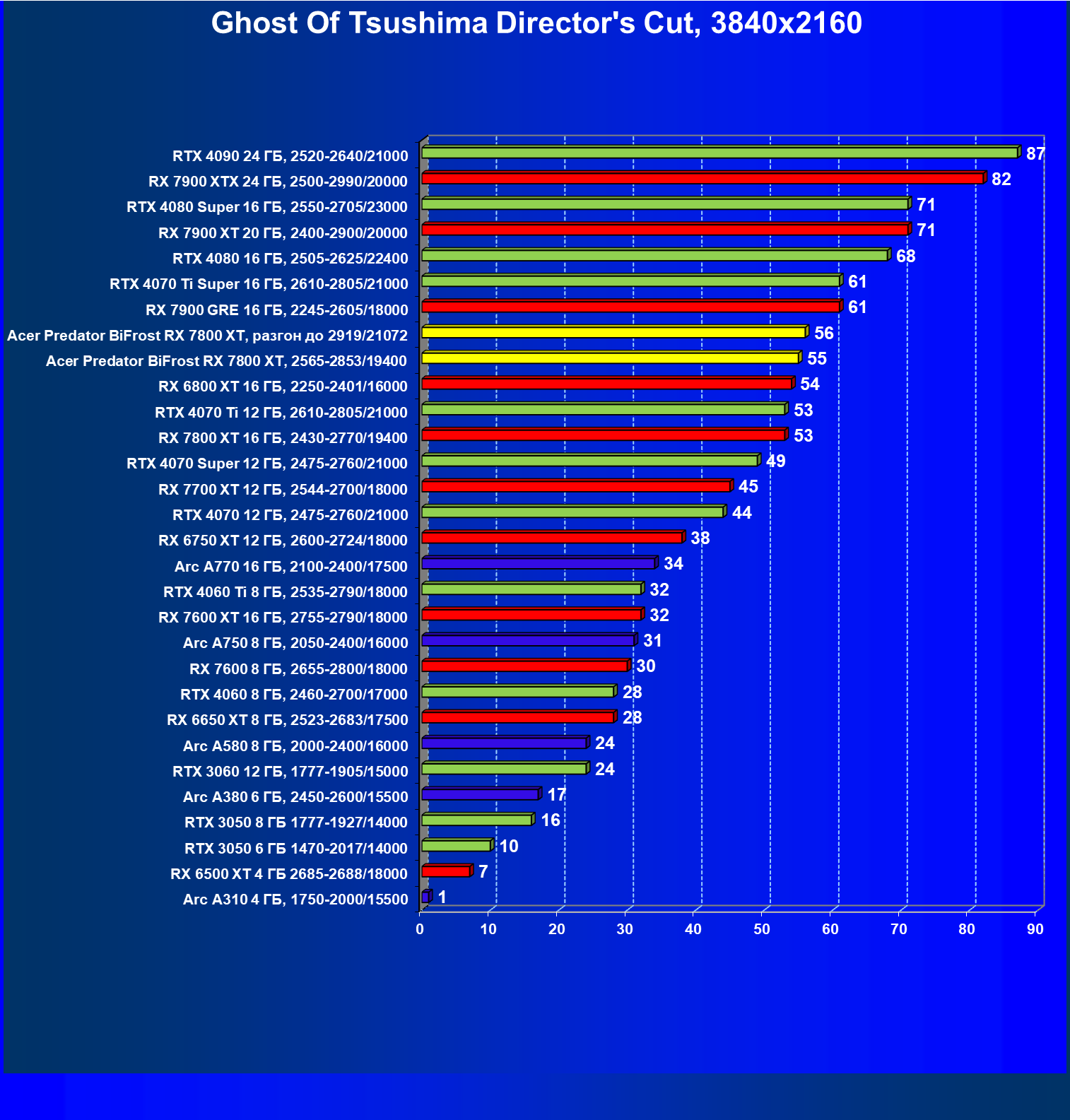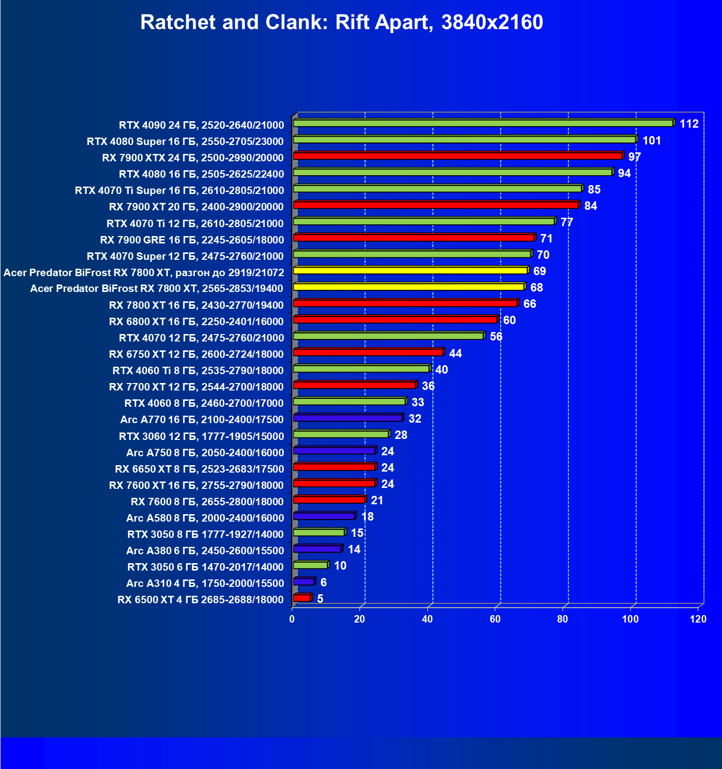 Radeon RX 7800 XT оказался ненамного производительнее своего предшественника Radeon RX 6800 XT, но против GeForce RTX 4070 карта AMD выступила хорошо, обогнав его на 9%-10%. Карта Acer из-за фабричного разгона в среднем на 4% быстрее референсного ускорителя. А ручной разгон позволил этой карте вплотную подобраться к GeForce RTX 4070 Super.