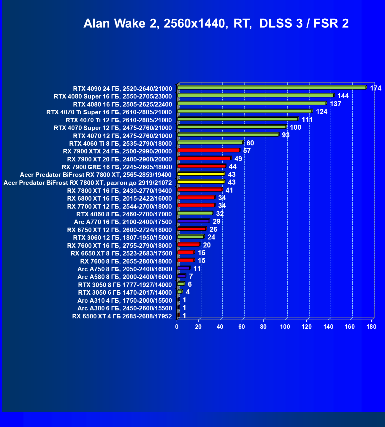 А здесь мы видим, что из-за более эффективной работы GeForce RTX 4070 с трассировкой лучей и более широкой поддержки DLSS 3 в современных играх (FSR 3 пока только начинает свой путь на рынок) Radeon RX 7800 XT проигрывает.