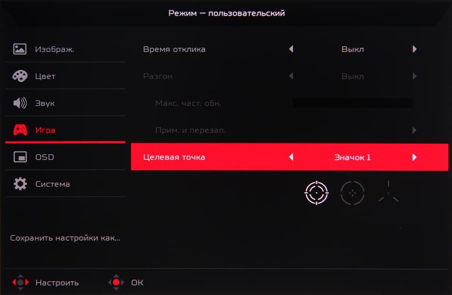 Игрокам может пригодиться возможность вывода прицела в центре экрана (пункт Целевая точка). Но нужно учитывать, что прицел белый, его плохо видно на светлом фоне, а на белом не видно вообще.