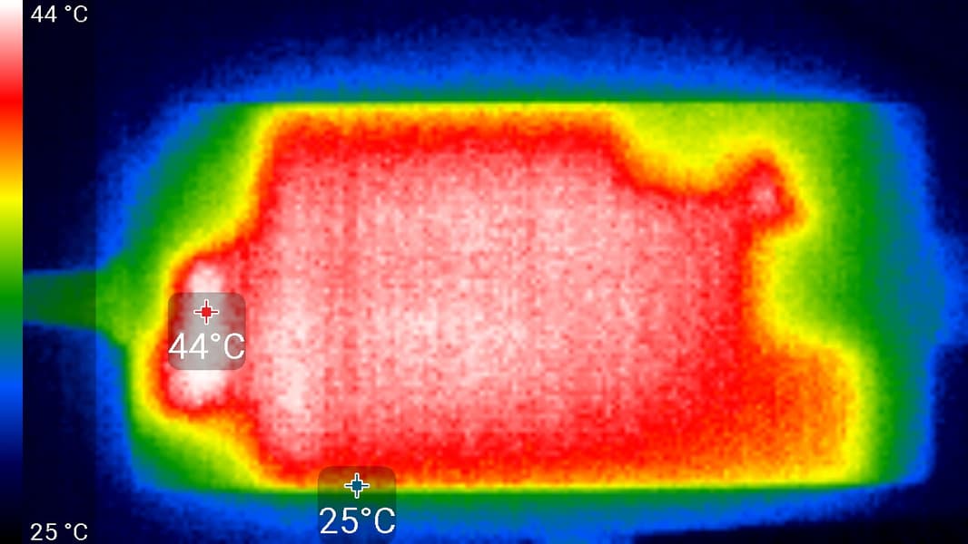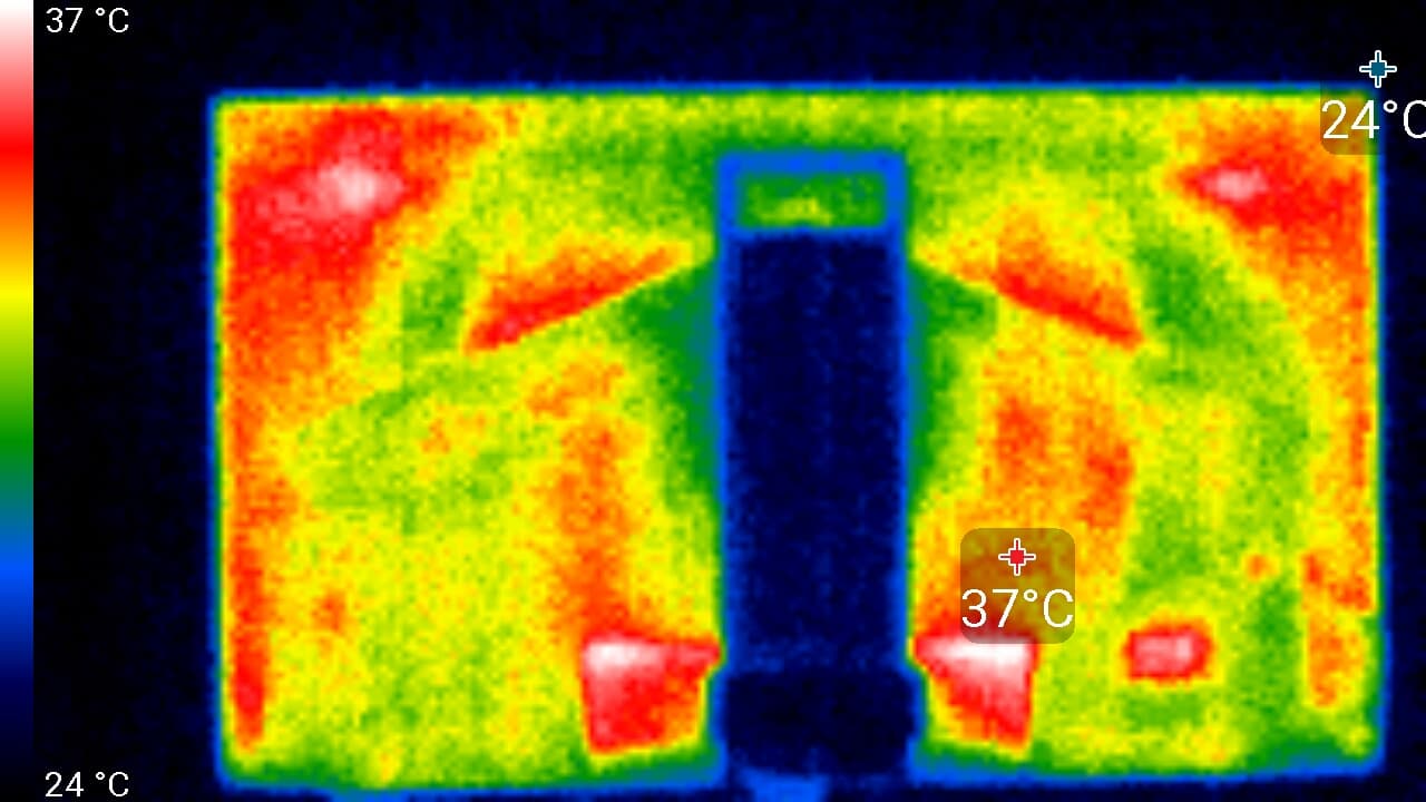 Нагрев монитора можно оценить по приведенным снимкам с ИК-камеры, полученным после долговременной работы монитора на максимальной яркости в режиме HDR (734 кд/м², потребление 121 Вт) в помещении с температурой примерно 24 °C: