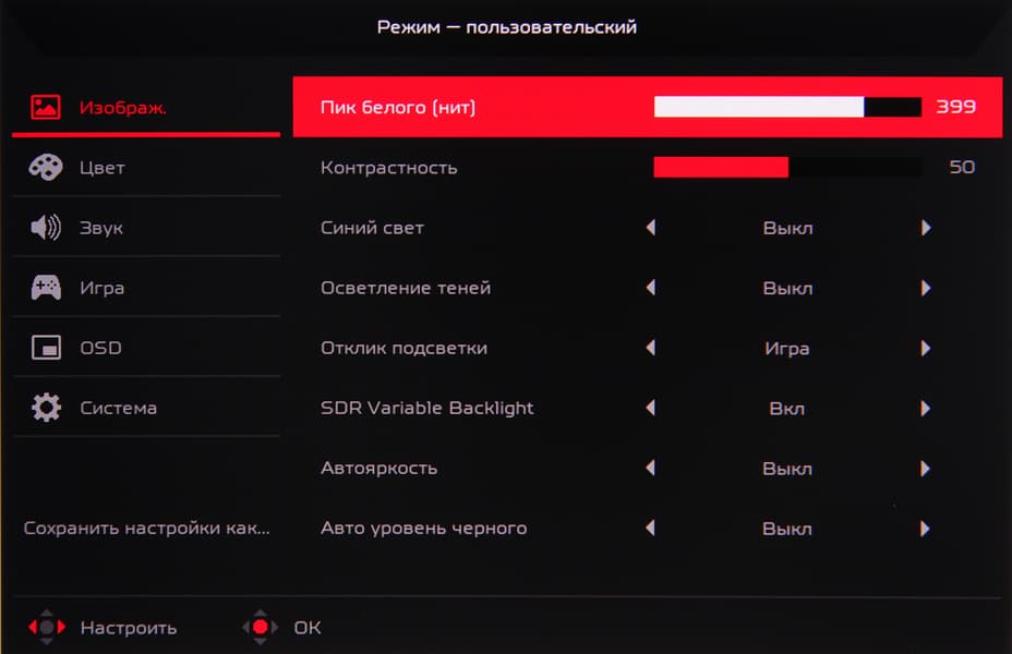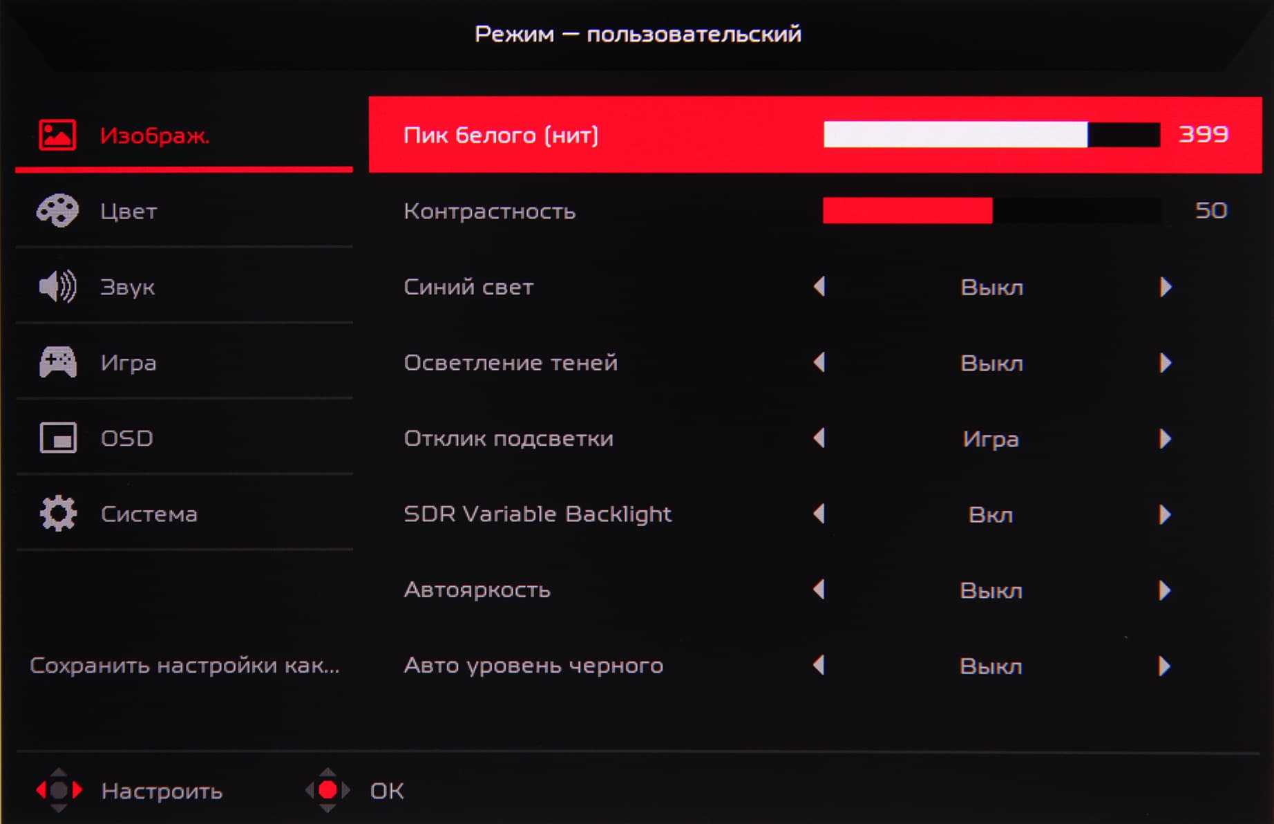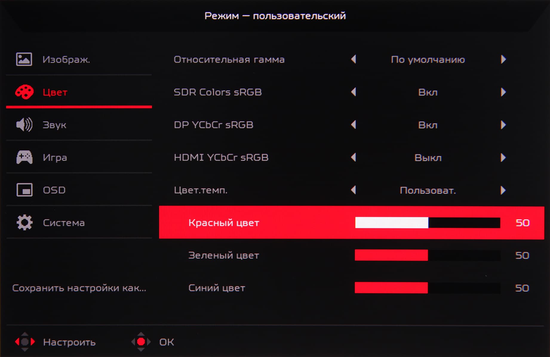 Дополнительно можно скорректировать гамму, подправить уровень черного, включить режим сниженной интенсивности синего цвета и т. д. Примечательно, что есть возможность принудительно выбрать цветовой охват sRGB для режима SDR и для компонентного сигнала по DisplayPort и HDMI.
