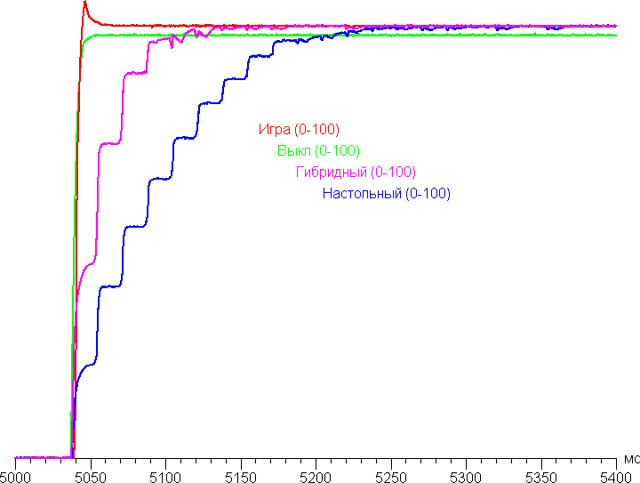 Ниже приведены графики полутонового перехода между оттенками 40% и 60% и обратно при различных значениях настройки Время отклика (по вертикали — яркость, по горизонтали — время, для наглядности графики выстроены последовательно):