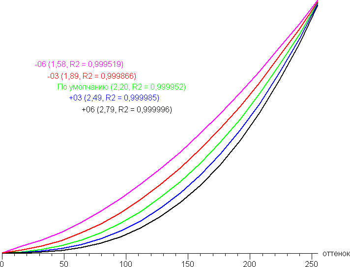Реальная гамма-кривая зависит от выбранного значения коррекции списке Относительная гамма (значения показателей аппроксимирующей функции приведены в скобках в подписях, там же — коэффициент детерминации):
