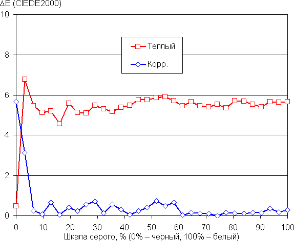 Цветопередача при выборе профиля Теплый близка к стандартной, но все равно мы попытались вручную скорректировать цвета, регулируя усиление трех основных цветов. Графики ниже показывают цветовую температуру на различных участках шкалы серого и отклонение от спектра абсолютно черного тела (параметр ΔE) в случае профиля Теплый и после ручной коррекции: