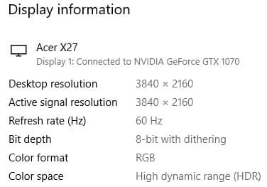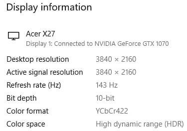 При подключении к компьютеру по DisplayPort поддерживалось разрешение до 3840×2160 при 144 Гц кадровой частоты на вход, и вывод изображения на экран также осуществлялся с этой частотой. При таком разрешении и частоте обновления поддерживаются G-Sync, HDR и 10 бит на цвет, но кодирование цвета цветоразностное со сниженной цветовой четкостью.