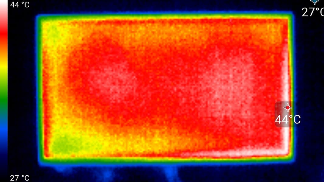 Нагрев нельзя назвать очень большим, что и не удивительно при как минимум трех работающих вентиляторах в корпусе блока экрана. Корпус БП нагрелся до 44 °C, что также не очень много: