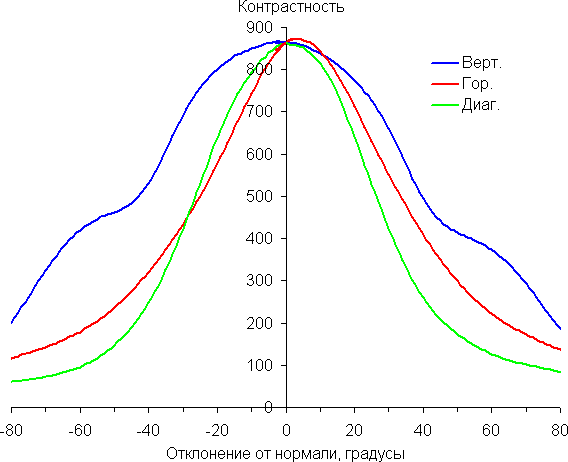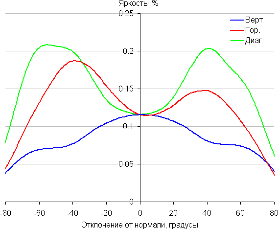 Отметим плавное уменьшение яркости при отклонении от перпендикуляра к экрану в горизонтальном направлении, при этом графики не пересекаются во всем диапазоне измеряемых углов. Чуть быстрее падает яркость при отклонении в вертикальном направлении. При отклонении в диагональном направлении поведение яркости оттенков имеет промежуточный характер между вертикальным и горизонтальным направлениями. Примечательно, что даже в случае отклонения по диагонали яркость черного поля возрастает не очень сильно, что очень хорошо и обычно нехарактерно для матриц IPS, используемых в мониторах. Контрастность в диапазоне углов ±82° остается значительно выше отметки 10:1.