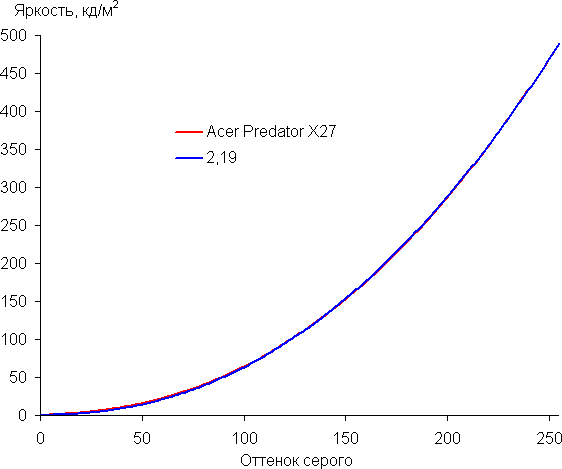 Аппроксимация полученной гамма-кривой дала показатель 2,19, что очень близко к стандартному значению 2,2, при этом реальная гамма-кривая мало отклоняется от аппроксимирующей степенной функции: