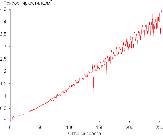 Реальная гамма-кривая ближе всего к стандартной при выборе варианта По умолчанию, что совпало с нашими ожиданиями. Поэтому далее мы измерили яркость 256 оттенков серого (от 0, 0, 0 до 255, 255, 255) при этом значении. График ниже показывает прирост (не абсолютное значение!) яркости между соседними полутонами:
