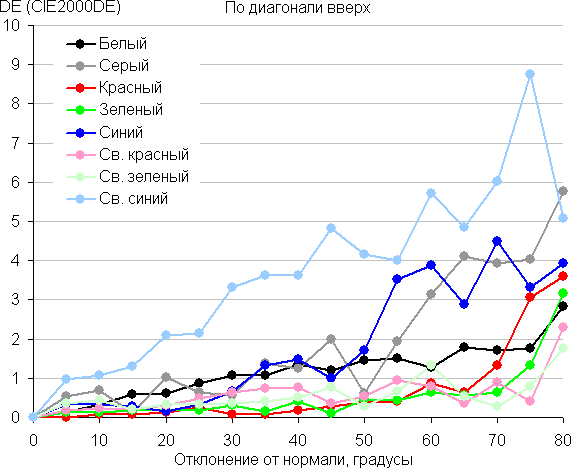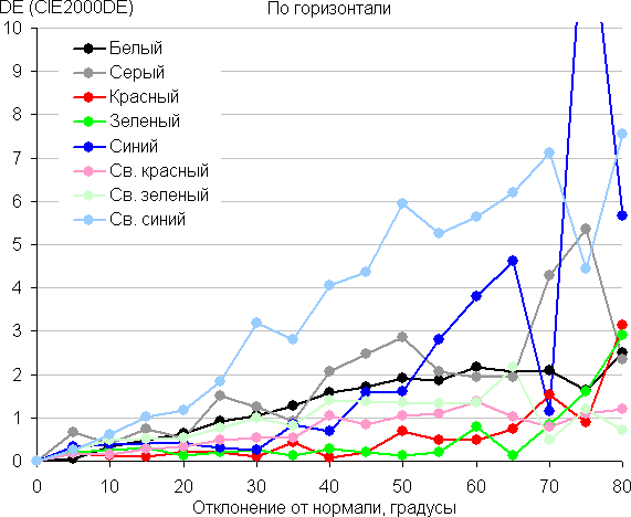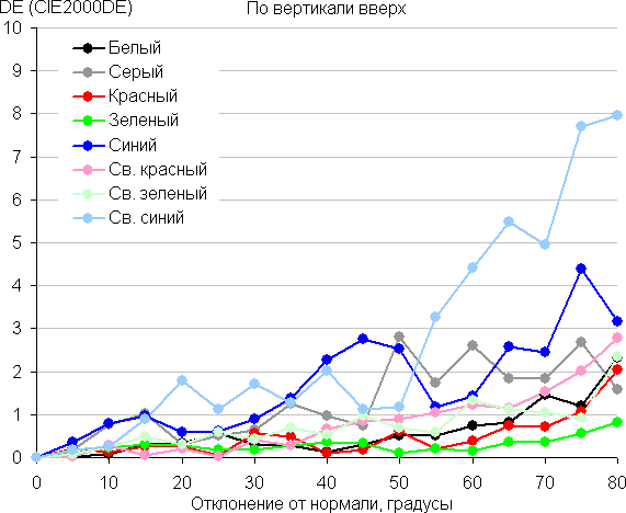 Для количественной характеристики изменения цветопередачи мы провели колориметрические измерения для белого, серого (127, 127, 127), красного, зеленого и синего, а также светло-красного, светло-зеленого и светло-синего полей во весь экран с использованием установки, подобной той, что применялась в предыдущем тесте. Измерения проводились в диапазоне углов от 0° (датчик направлен перпендикулярно к экрану) до 80° с шагом в 5°. Полученные значения интенсивностей были пересчитаны в ΔE относительно замера каждого поля при перпендикулярном положении датчика относительно экрана. Результаты представлены ниже: