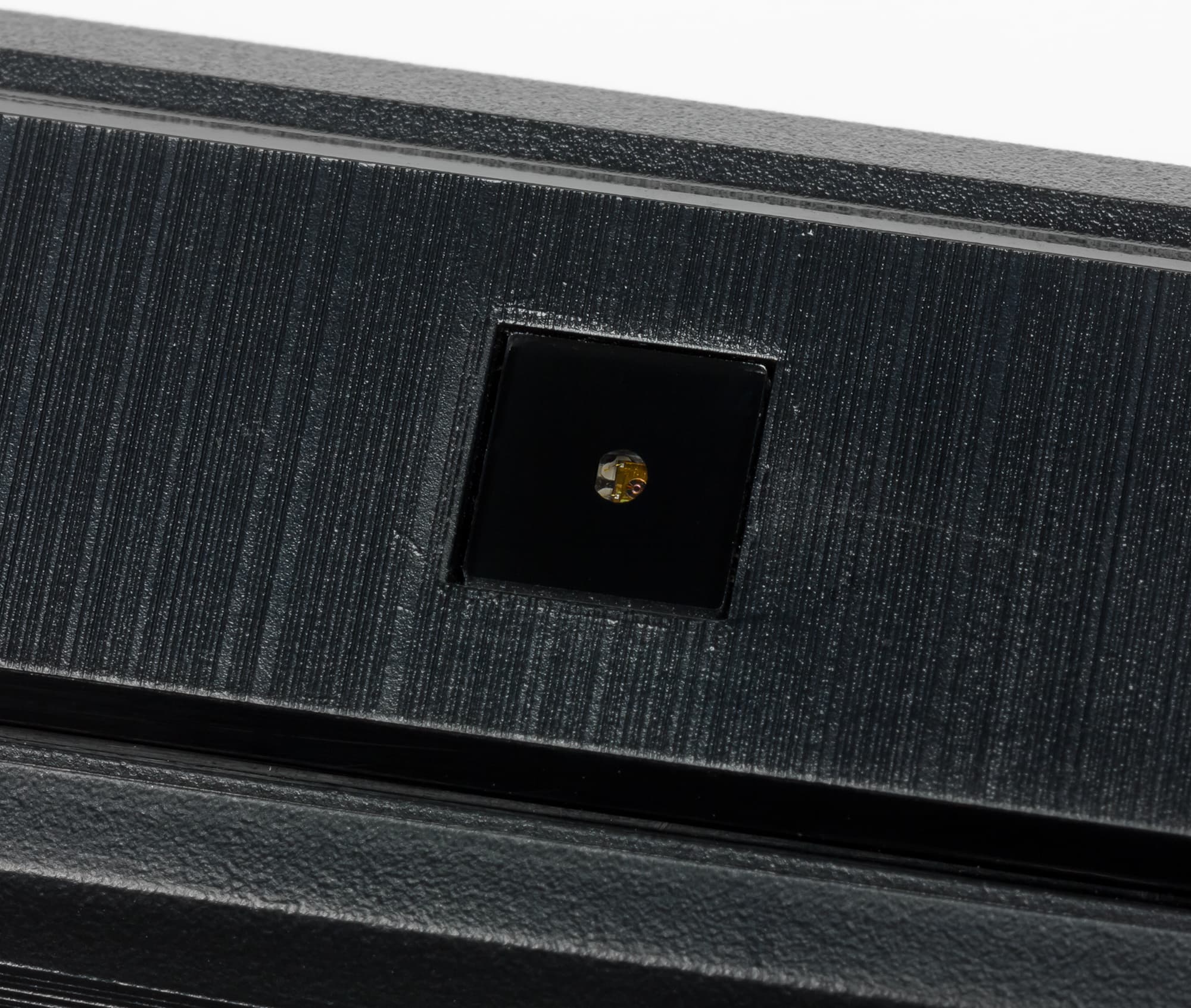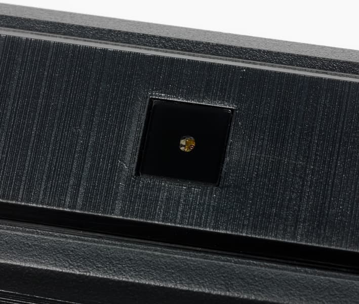 На стыке нижнего торца и фронтальной рамки ближе к правому углу находится белый светорассеиватель индикатора состояния. На верхнем торце по центру есть датчик освещенности.