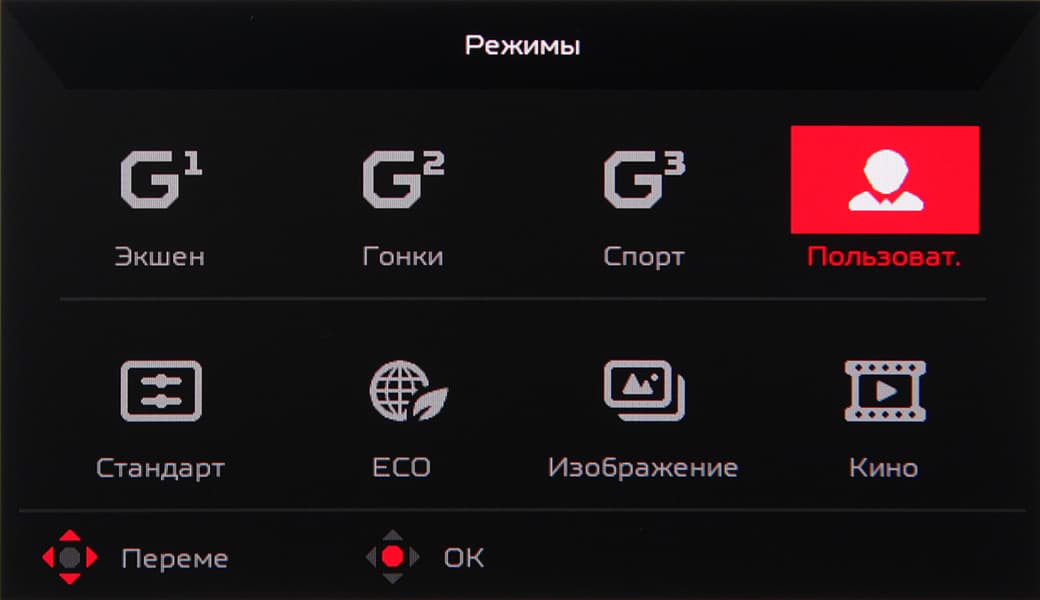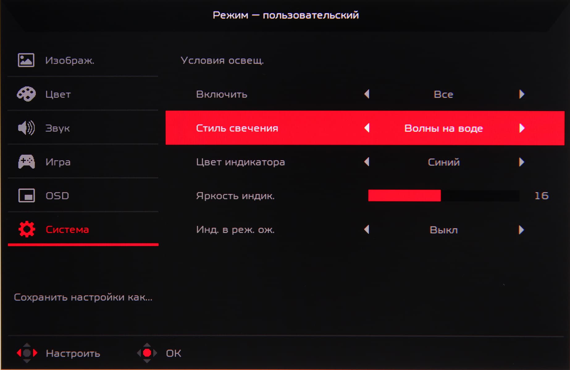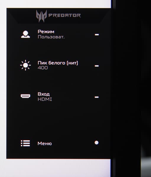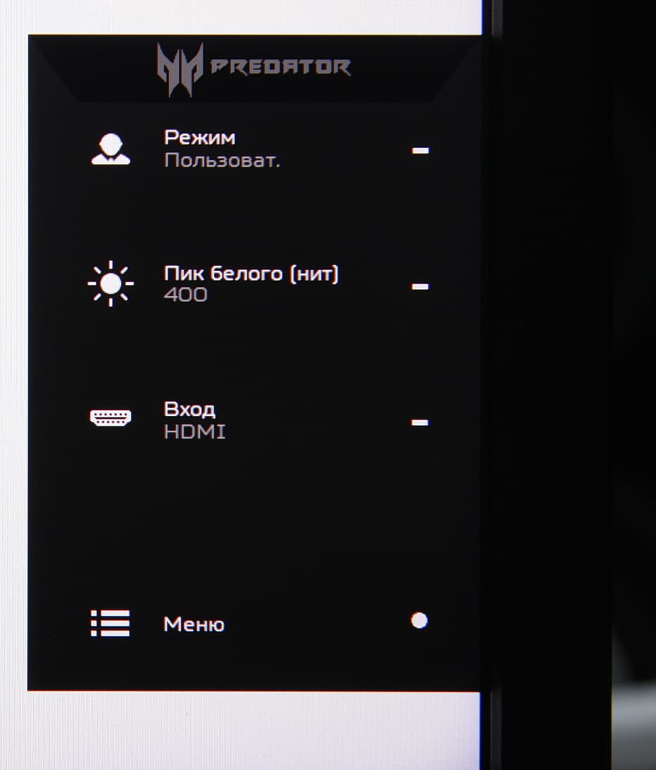 Индикатор питания при работе неярко светится синим, в режиме ожидания — оранжевым и не горит, если монитор условно выключен. Когда монитор включен и на экране нет меню, то при первом нажатии на кнопки (кроме кнопки питания) или нажатии или отклонении джойстика на экран выводится стартовое меню из четырех пунктов.