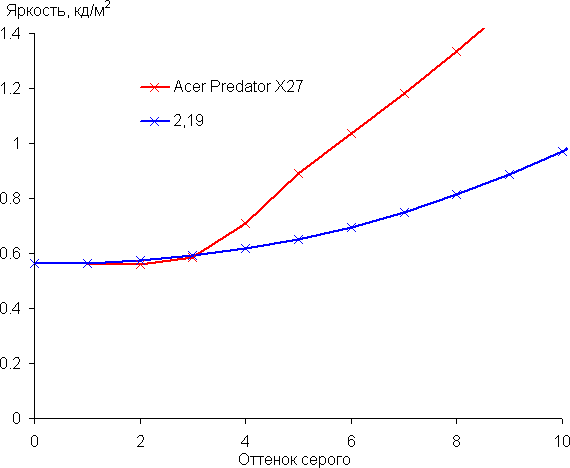 На большей части зависимости рост яркости равномерный и каждый следующий оттенок значимо ярче предыдущего. Однако в самой темной области два ближайших к черному оттенков не отличимы по яркости от черного цвета: