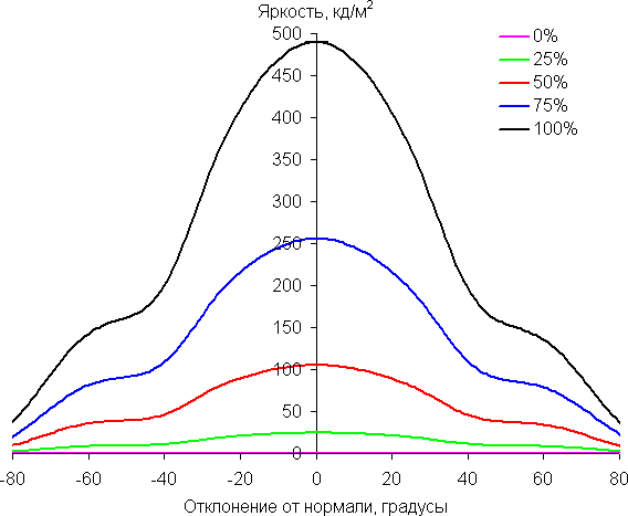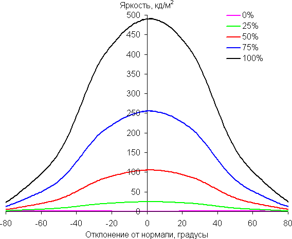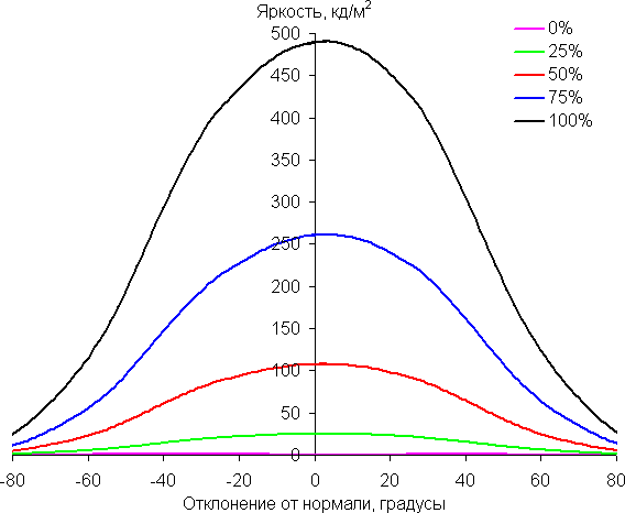 Чтобы выяснить, как меняется яркость экрана при отклонении от перпендикуляра к экрану, мы провели серию измерений яркости черного, белого и оттенков серого в центре экрана в широком диапазоне углов, отклоняя ось датчика в вертикальном, горизонтальном и диагональном направлениях.