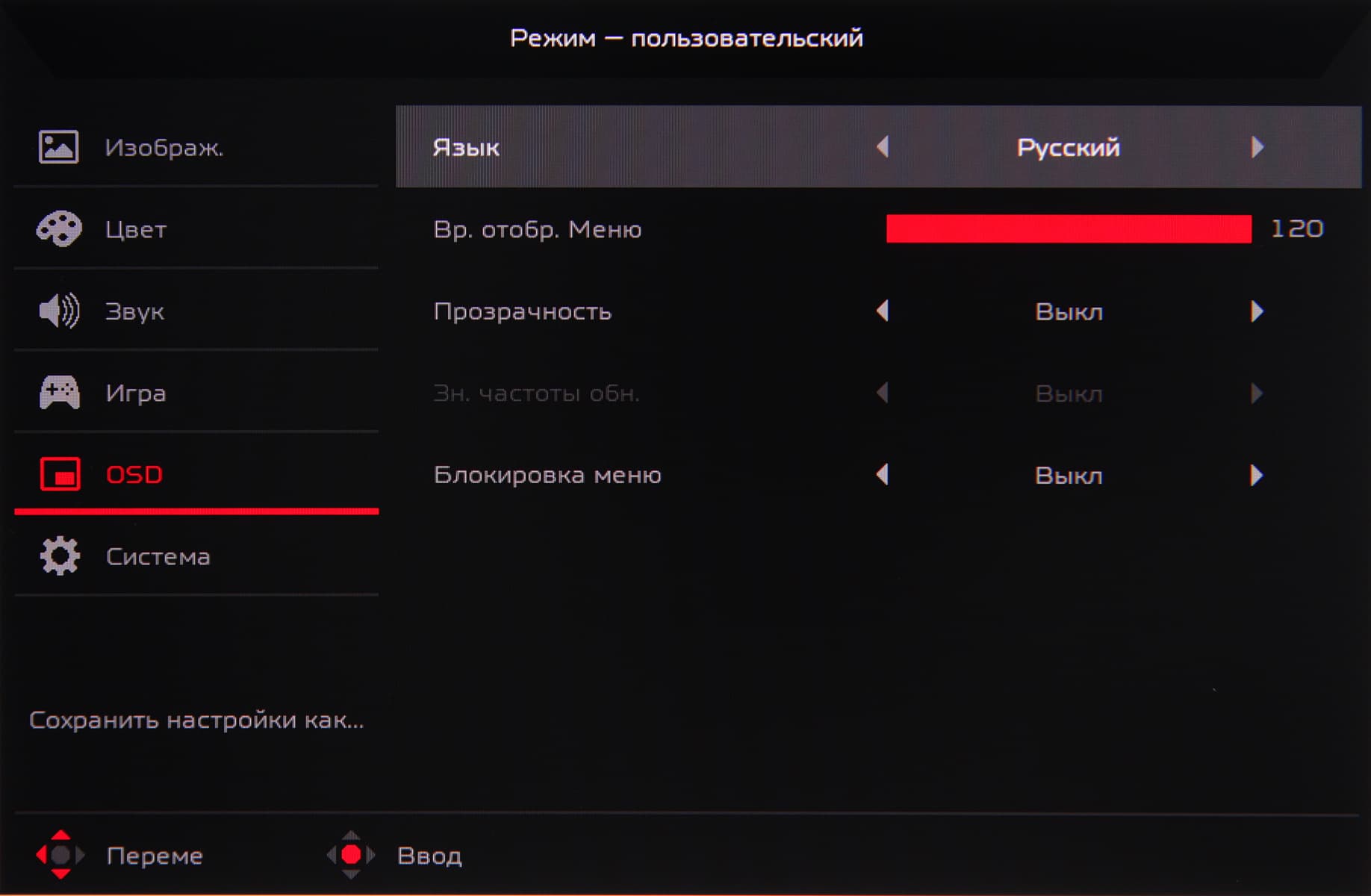 При необходимости можно установить уровень прозрачности фона и выбрать тайм-аут автоматического выхода из меню. Есть русская версия экранного меню. Кириллический шрифт меню ровный, надписи читаемые. Качество перевода на русский язык хорошее.