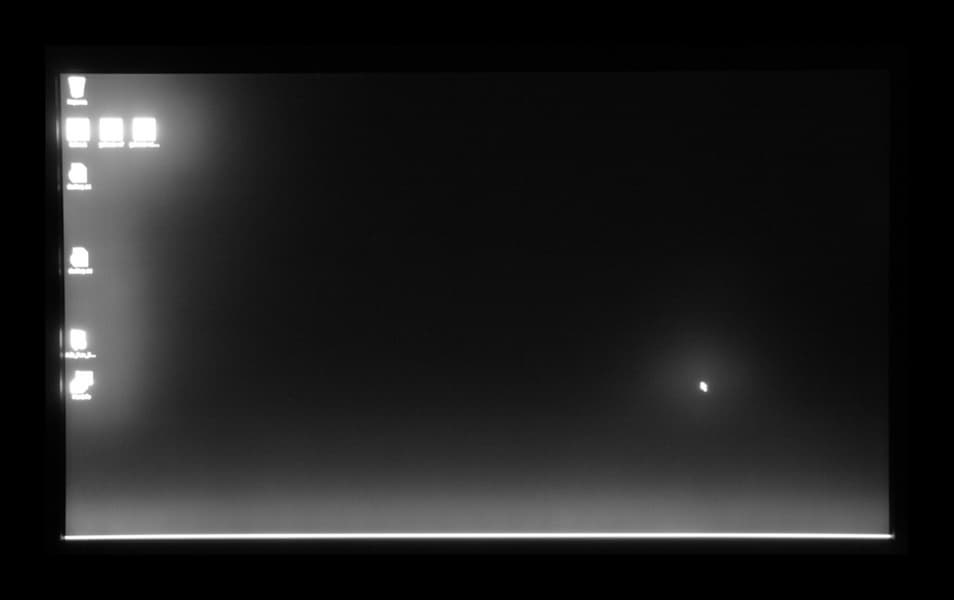 Данный монитор оснащен прямой многозонной (заявлено о 384 зонах) светодиодной подсветкой. Регулировка яркости по зонам всегда активна в режиме HDR, но в режиме SDR ее можно выключить (параметр SDR Variable Backlight). Если регулировка включена, то яркие объекты на экране подсвечиваются, а темные — затемняются. Так как зон гораздо меньше, чем пикселей, то зона подсветки может быть гораздо больше яркого объекта и захватывать темные участки. Для примера приведем фотографию, полученную при выводе на экран черного рабочего стола с несколькими пиктограммами, полоской задач и курсором мыши: