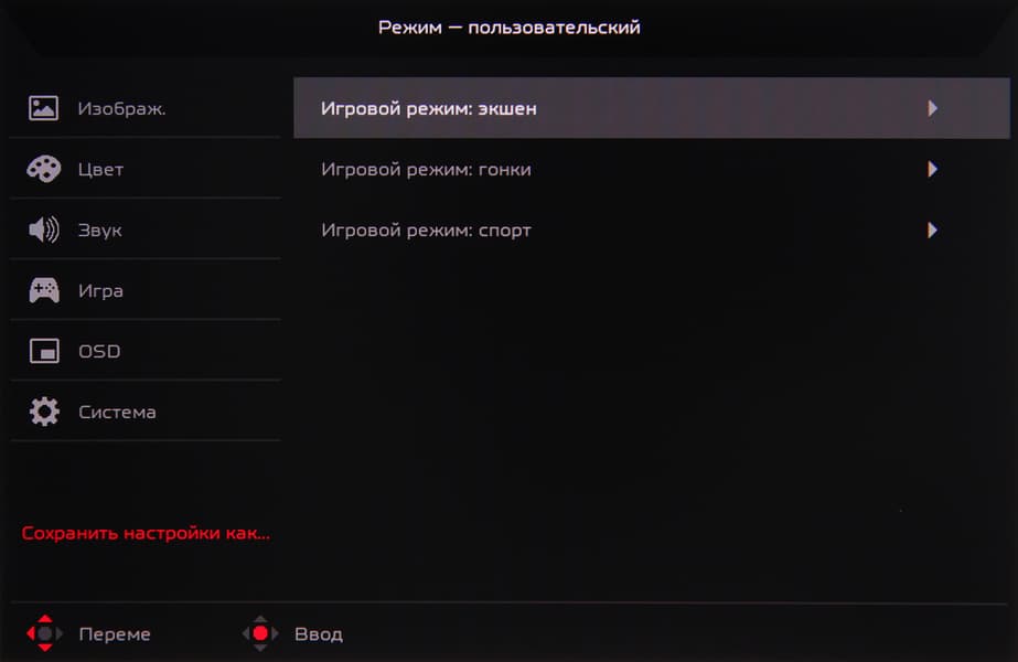 Три набора значений настроек можно сохранить в трех игровых профилях: