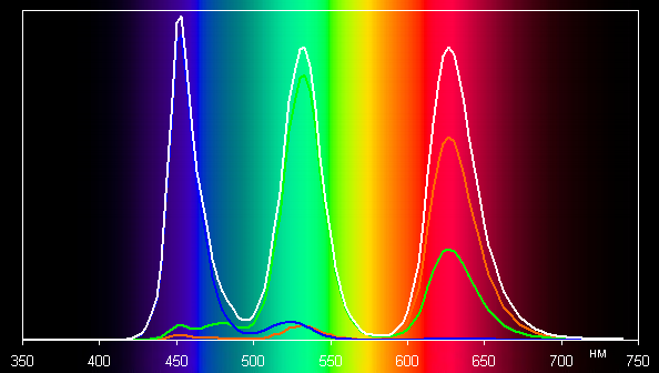 Ниже приведен спектр для белого поля (белая линия), наложенный на спектры красного, зеленого и синего полей (линии соответствующих цветов), когда нет корректировки цветового охвата (или она минимальная):