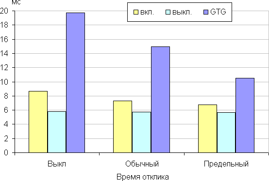 Время отклика зависит от значения одноименной настройки, которая управляет разгоном матрицы. Ступени регулировки три. График ниже показывает, как меняется время включения и выключения при переходе черный-белый-черный (столбики «вкл.» и «выкл.»), а также среднее суммарное время для переходов между полутонами (столбики GTG):