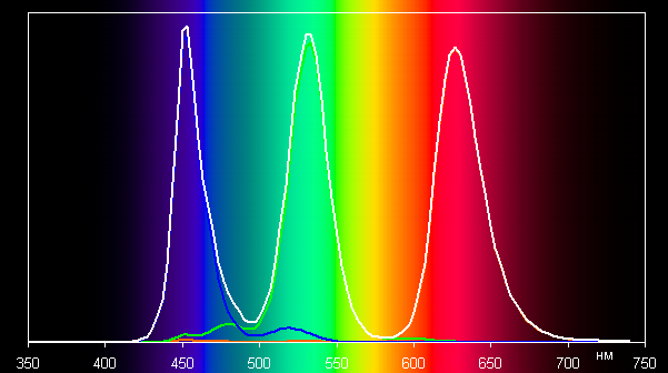 По тому, насколько пики узкие, можно предположить, что в светодиодах подсветки применяется синий, зеленый и красный излучатель. Однако в описании монитора упоминается про Quantum Dot, поэтому, возможно, применяется синий излучатель и зеленый и красный люминофоры на основе квантовых точек.