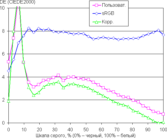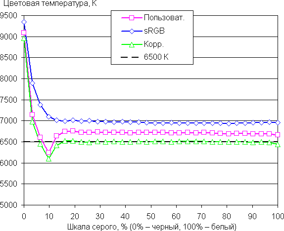 Графики ниже показывают цветовую температуру на различных участках шкалы серого и отклонение от спектра абсолютно черного тела (параметр ΔE) в случае отсутствия какой-либо коррекции (подписано — Пользоват.), после коррекции цветового баланса (50/50/48 для усиления красного/зеленого/синего — Корр.) и при выборе профиля sRGB (sRGB) без дополнительной коррекции (которая, впрочем, и так невозможна):