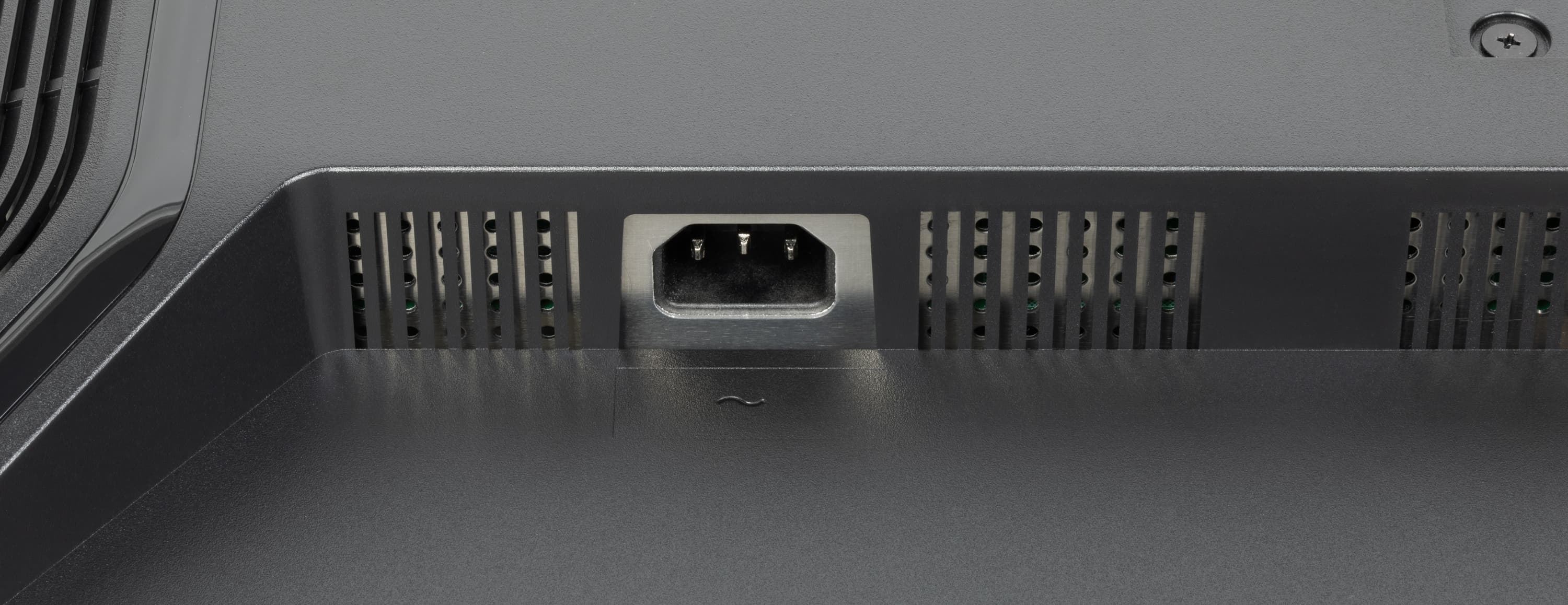 Разъем питания и все интерфейсные разъемы расположены в незамкнутой нише сзади и ориентированы вниз. Подключать кабели к монитору неудобно. Также на задней панели можно обнаружить разъем для кенсингтонского замка. Отходящие кабели пластиковой скобкой можно прижать к стойке подставки.