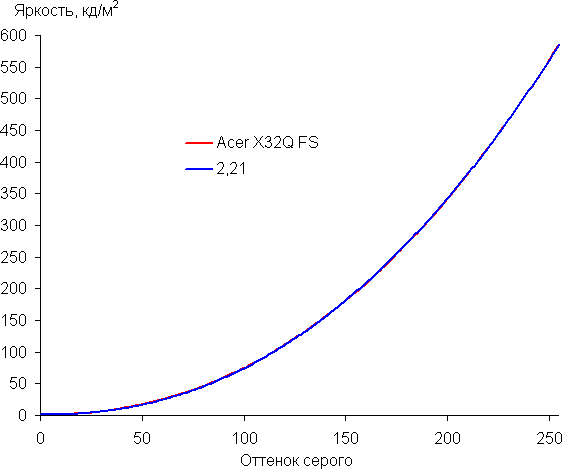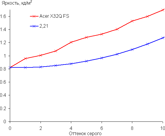 Рост прироста яркости весьма равномерный. При этом каждый следующий оттенок значимо ярче предыдущего, даже в темной области, что для игрового монитора очень полезно:
