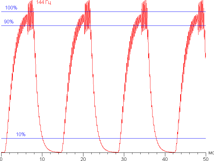 Видно, что при 144 Гц чередования максимальная яркость белого кадра гораздо выше уровня 90% белого, а минимальная яркость черного кадра равна черному в статике. Амплитуда изменения яркости значительно выше 80% от уровня белого. То есть согласно этому формальному критерию скорости матрицы достаточно для вывода изображения с кадровой частотой 144 Гц.