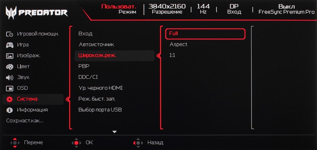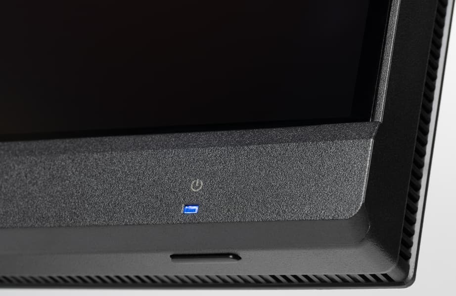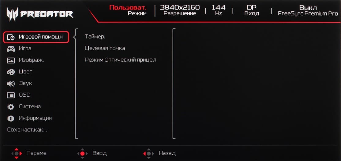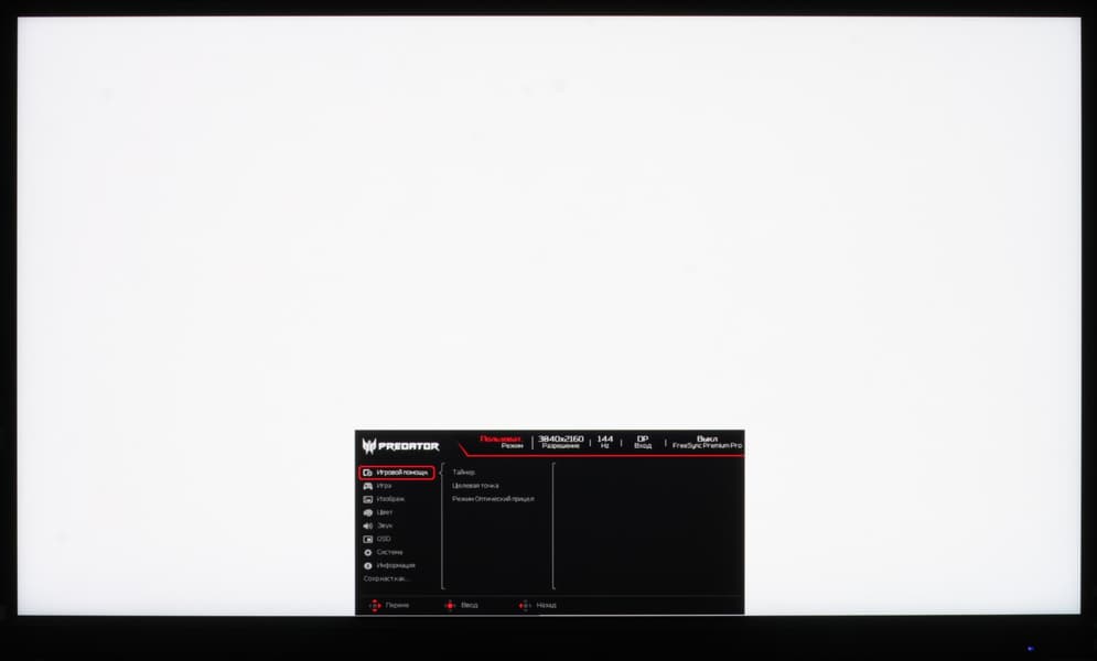 Индикатор питания при работе неярко светится синим, в режиме ожидания — оранжевым и не горит, если монитор условно выключен. Когда монитор включен и на экране нет меню, то при первом нажатии, или отклонении джойстика на экран выводится меню с настройками монитора. Далее при навигации по меню в нижней его части есть подсказка по функциям джойстика.