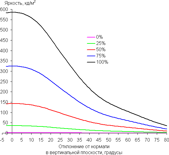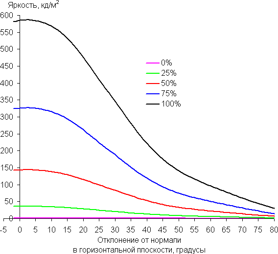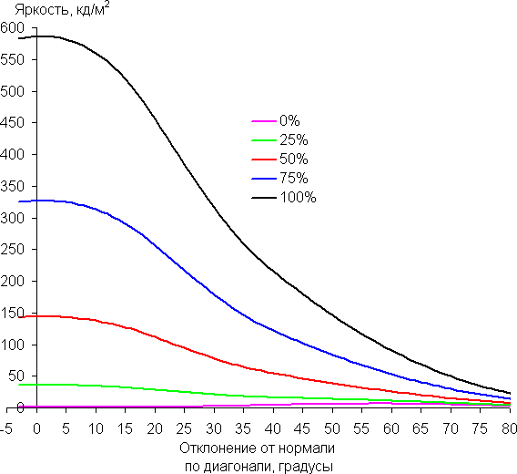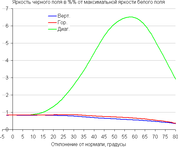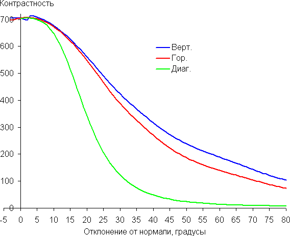 Углы обзора по снижению яркости не очень широкие. При отклонении в диагональном направлении яркость черного поля начинает резко возрастать уже при 20°-30° отклонения от перпендикуляра к экрану. Если сидеть не очень далеко от экрана, то черное поле по углам будет заметно светлее, чем в центре. Контрастность в случае отклонения по диагонали опускается ниже отметки 10:1 при отклонении более чем на 68°.