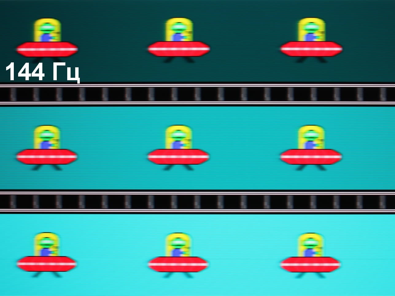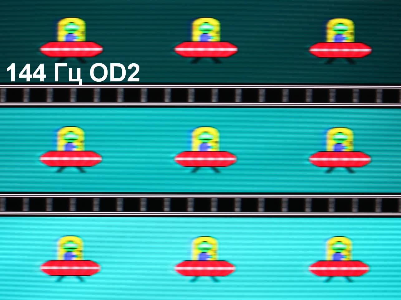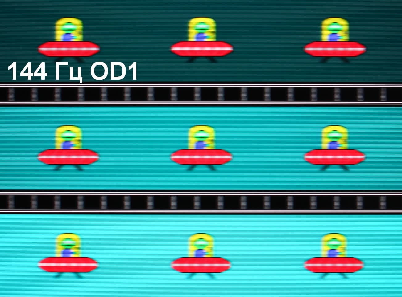Для наглядного представления о том, что на практике означает такая скорость матрицы, какие могут быть артефакты от разгона, приведем серию снимков, полученных с помощью движущейся камеры. Такие снимки показывают, что видит человек, если он следит глазами за двигающимся на экране объектом. Описание теста приведено тут, страница с самим тестом тут. Использовались рекомендованные установки (скорость движения 960 пиксель/с для частот обновления 60 и 120 Гц, 1008 пиксель/с для часты обновления 144 Гц), выдержка 1/15 с, на фотографиях указаны значения частоты обновления, а также ступень разгона (ODx).