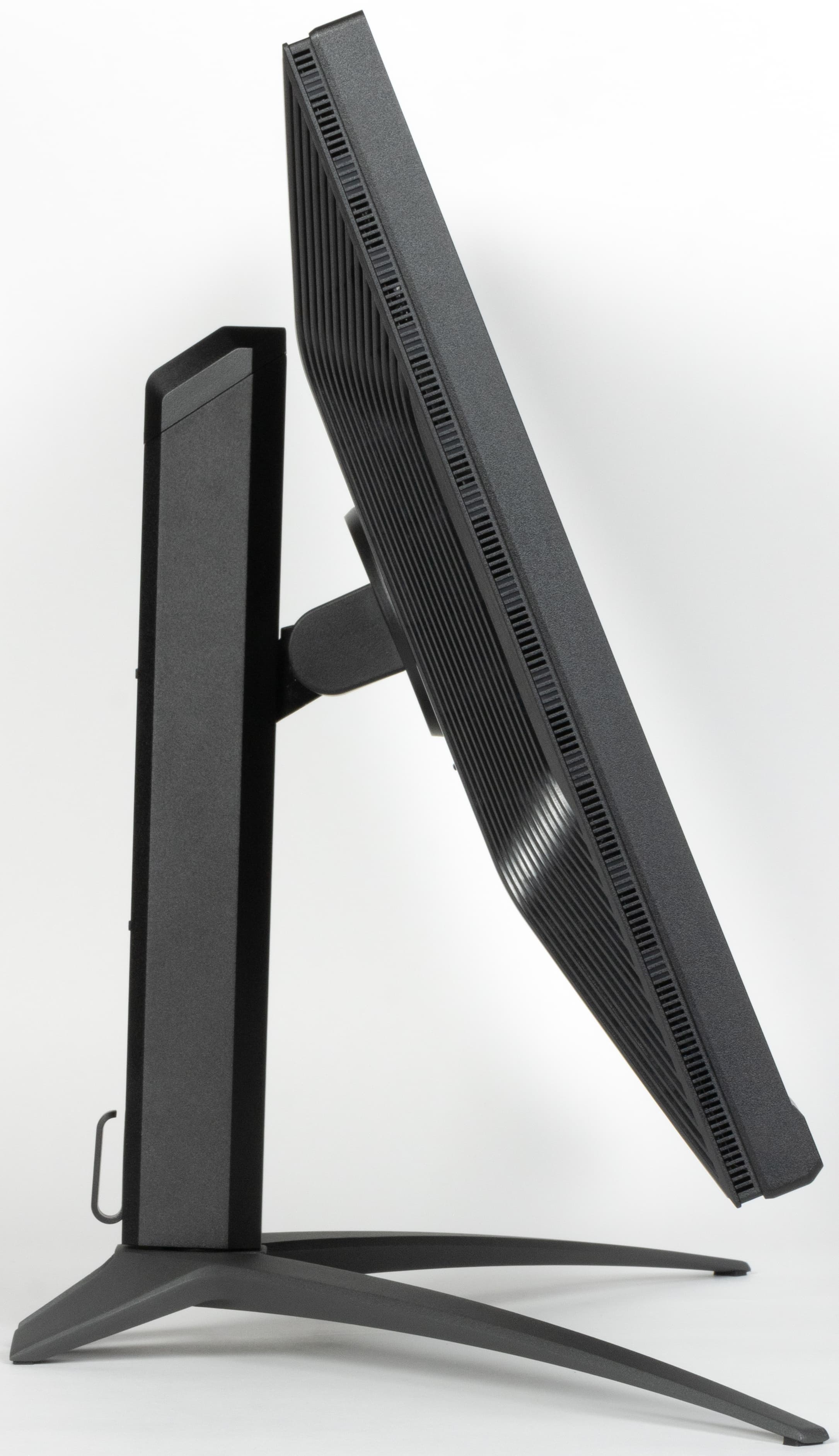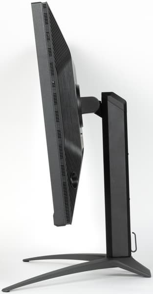 В целом дизайн умеренно игровой, поэтому с точки зрения внешнего вида монитор можно считать универсальным. Ориентацию на игроков выдают разве что дизайн подставки и надпись на фронтальной планке по центру. Панели монитора и кожухи стойки подставки изготовлены из черного пластика в основном с просто матовой поверхностью. Внешняя поверхность матрицы черная, полуматовая, жесткая. Экран выглядит как монолитная поверхность, ограниченная снизу относительно узкой планкой, а сверху и по бокам — узкой окантовкой. Выведя изображение на экран, можно увидеть, что на самом деле между внешними границами экрана и собственно областью отображения есть неширокие поля — по 8 мм до внешних краев сверху и по бокам и примерно 2 мм до планки снизу.