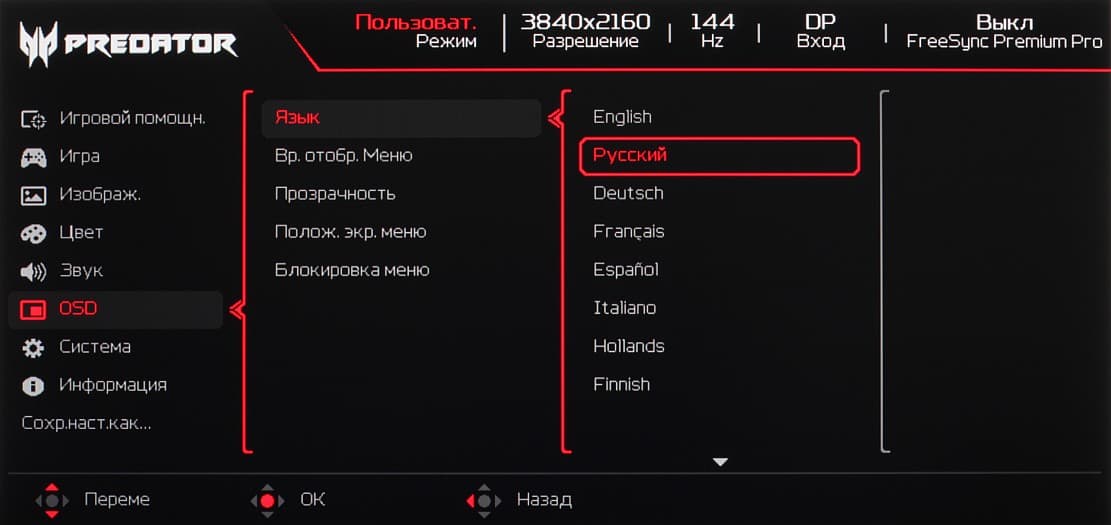 Навигация удобная, так как все делается только джойстиком, не нужно переносить палец на кнопки, к тому же списки зациклены. При настройке изображения меню остается на экране — это несколько мешает оценке вносимых изменений. При необходимости можно установить уровень прозрачности фона, выбрать тайм-аут автоматического выхода из меню, переместить меню в одну из пяти позиций и включить блокировку меню для предотвращения случайного изменения настроек. Есть русская версия экранного меню. Кириллический шрифт меню ровный, надписи читаемые. Качество перевода на русский язык хорошее.