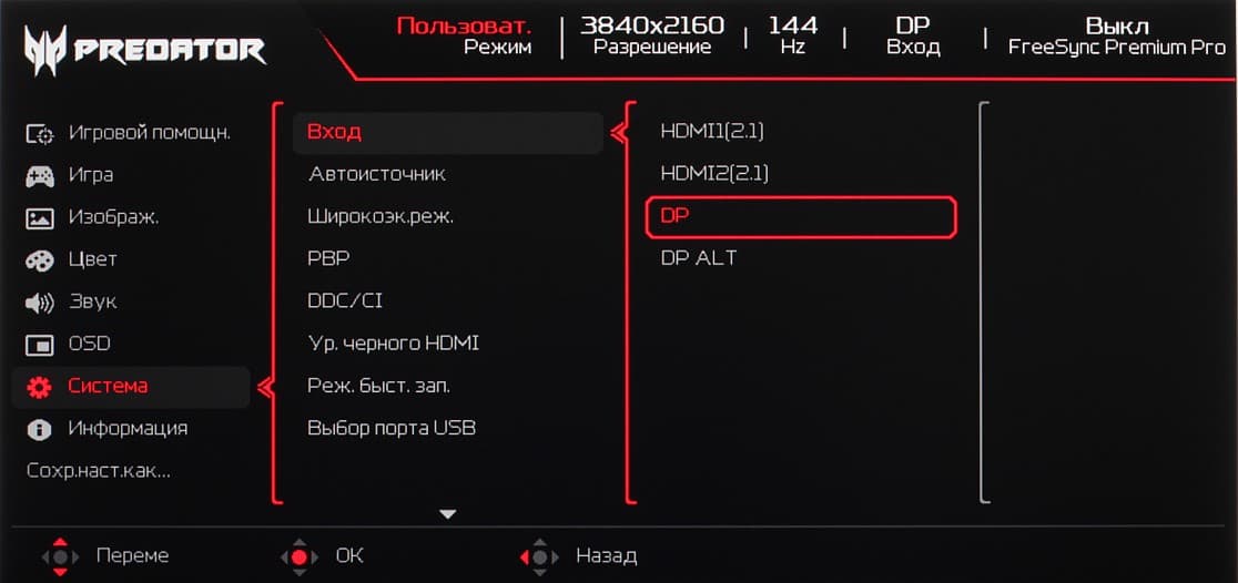 Представление об оснащенности интерфейсами дает таблица с характеристиками в начале статьи. Монитор имеет четыре цифровых входа, поддерживающих прием видеосигнала, — DisplayPort, пара HDMI и USB-C. Выбор входа осуществляется в основном меню установок.