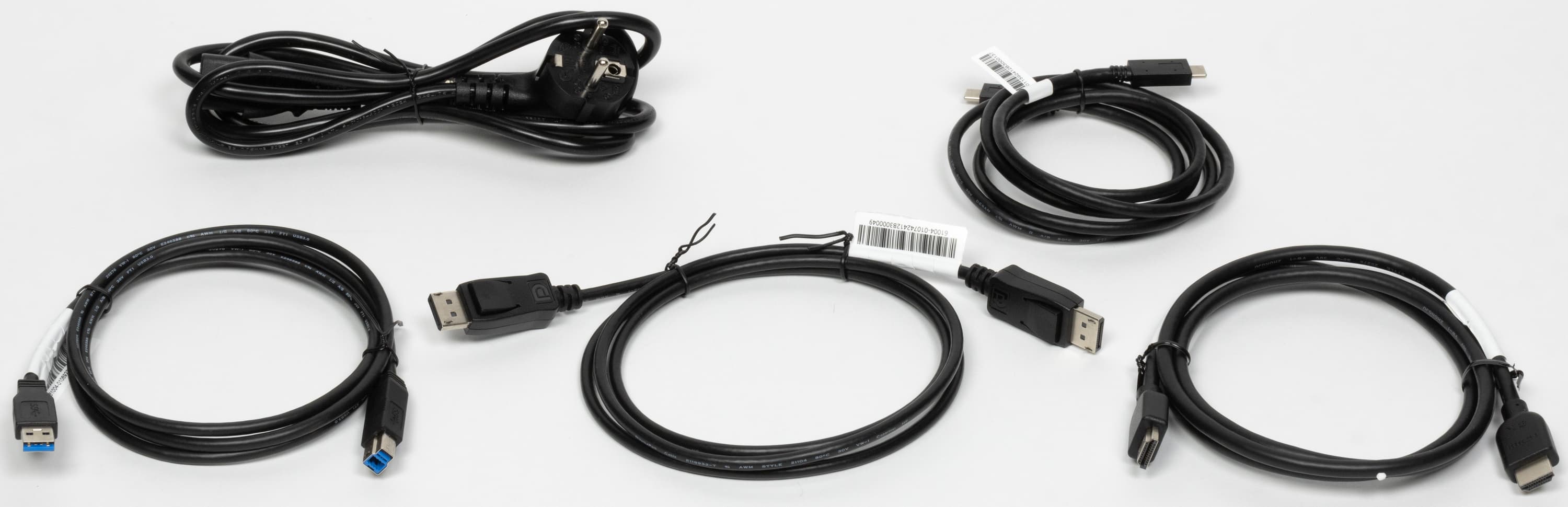 К монитору прилагается неплохой комплект кабелей (но не очень длинных), а на кабеле HDMI даже указано, что он поддерживает сигнал 8К. Качество кабелей с виду хорошее, и качество подтверждено тем, что в ходе тестирования с их использованием даже на предельных режимах никаких артефактов не было выявлено.