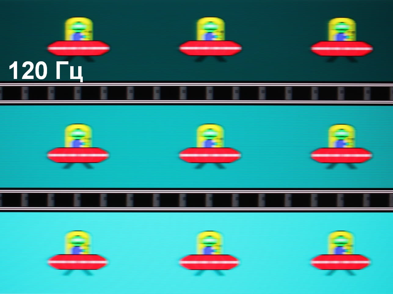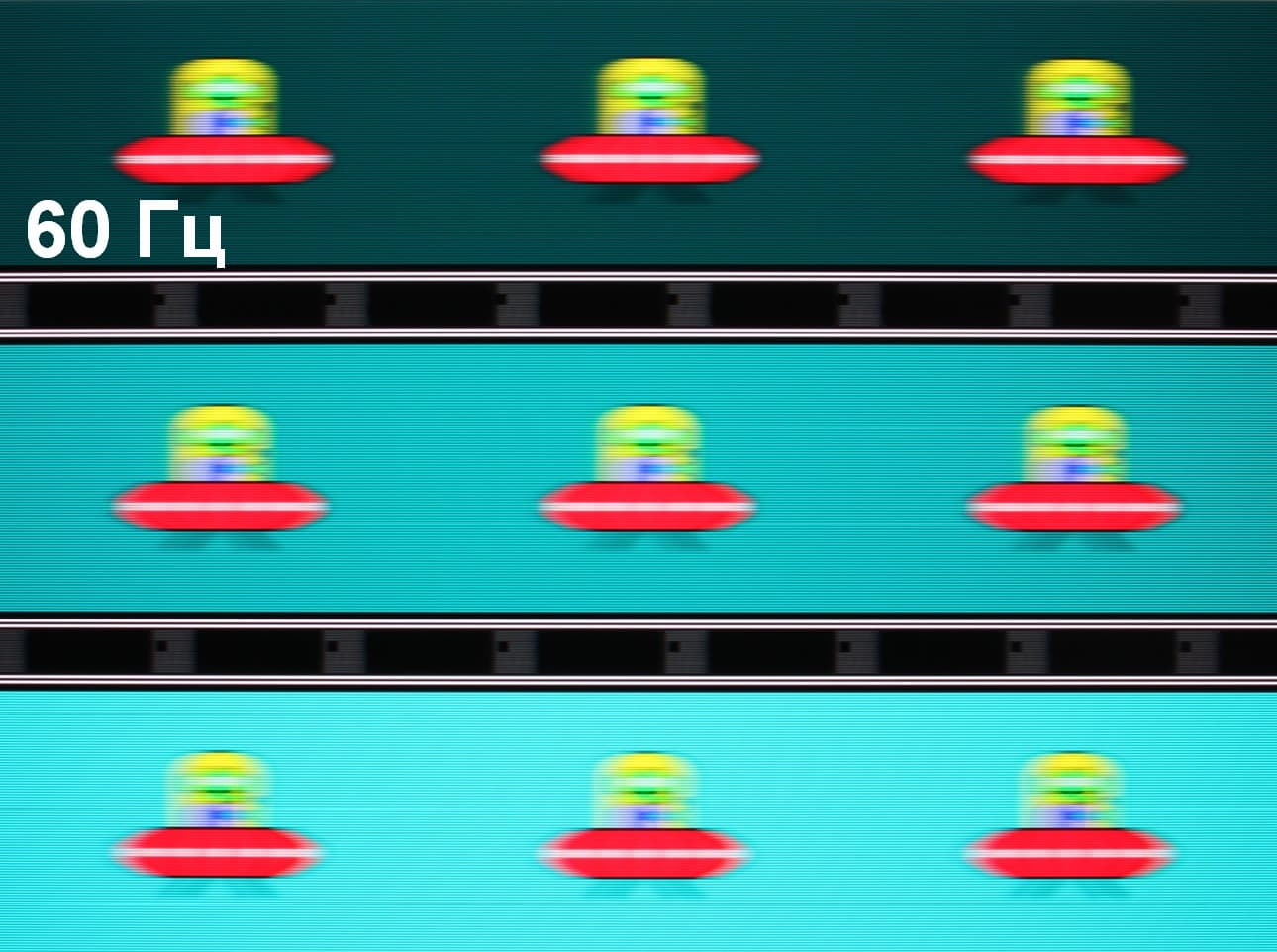 Попробуем представить, что было бы в случае матрицы с мгновенным переключением пикселей. Для нее при 60 Гц объект со скоростью движения 960 пиксель/с размывается на 16 пикселей, при 120 Гц — на 8 пикселей, при 144 Гц и 1008 пиксель/с — на 7 пикселя. Размывается, так как фокус зрения движется с указанной скоростью, а объект неподвижно выводится на 1/60, 1/120 или на 1/144 секунды. Для иллюстрации этого сымитируем размытие на 16, 8 и 7 пикселя: