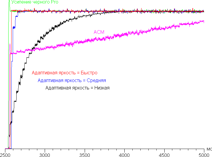 Однако в данном мониторе яркость светлых объектов при включении зональной подсветки сильно снижается, что делает этот режим бесполезным в случае HDR-изображений. В режиме SDR со снижением яркости смириться можно, так как запас ее есть. Работа зональной подсветки включается при выбора для настройки Адаптивная яркость значения, отличного от Выключено. При этом в ряду значений Низкая, Средняя, Быстро растет скорость изменения яркости подсветки. Не совсем понятно, зачем это нужно в принципе, так как по идее лучшим вариантом будет самое быстрое повышение и снижение яркости. Есть и динамический режим (настройка ACM) с изменением яркость по всей площади экрана, но в нем яркость меняется очень медленно, поэтому польза от него сомнительная. Режим Усиление черного Pro отвечает за затемнение темных участков с помощью регулировки пропускания ЖК-ячеек с не очевидной зависимостью от времени и положения темных участков на экране. Пользы от этой функции мы также не обнаружили. График ниже показывает, как увеличивается яркость (вертикальная ось) при переключении с черного поля (после 2,5 секунд вывода) на белое в случае активации трех описанных выше функций (зависимости для наглядности сглажены):