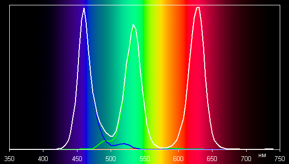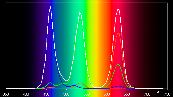 Ниже приведен спектр для белого поля (белая линия), наложенный на спектры красного, зеленого и синего полей (линии соответствующих цветов) в случае исходного цветового охвата: