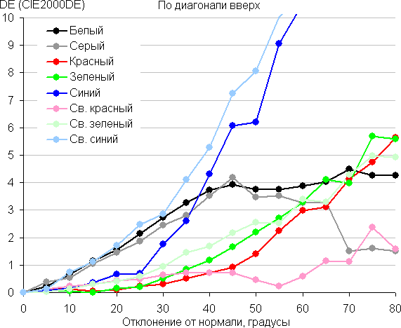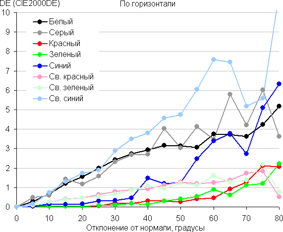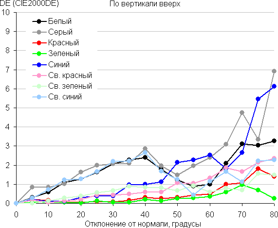 Для количественной характеристики изменения цветопередачи мы провели колориметрические измерения для белого, серого (127, 127, 127), красного, зеленого и синего, а также светло-красного, светло-зеленого и светло-синего полей во весь экран с использованием установки, подобной той, что применялась в предыдущем тесте. Измерения проводились в диапазоне углов от 0° (датчик направлен перпендикулярно к экрану) до 80° с шагом в 5°. Полученные значения интенсивностей были пересчитаны в ΔE относительно замера каждого поля при перпендикулярном положении датчика относительно экрана. Результаты представлены ниже: