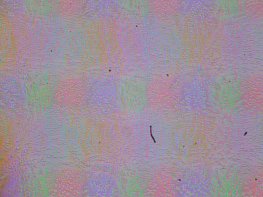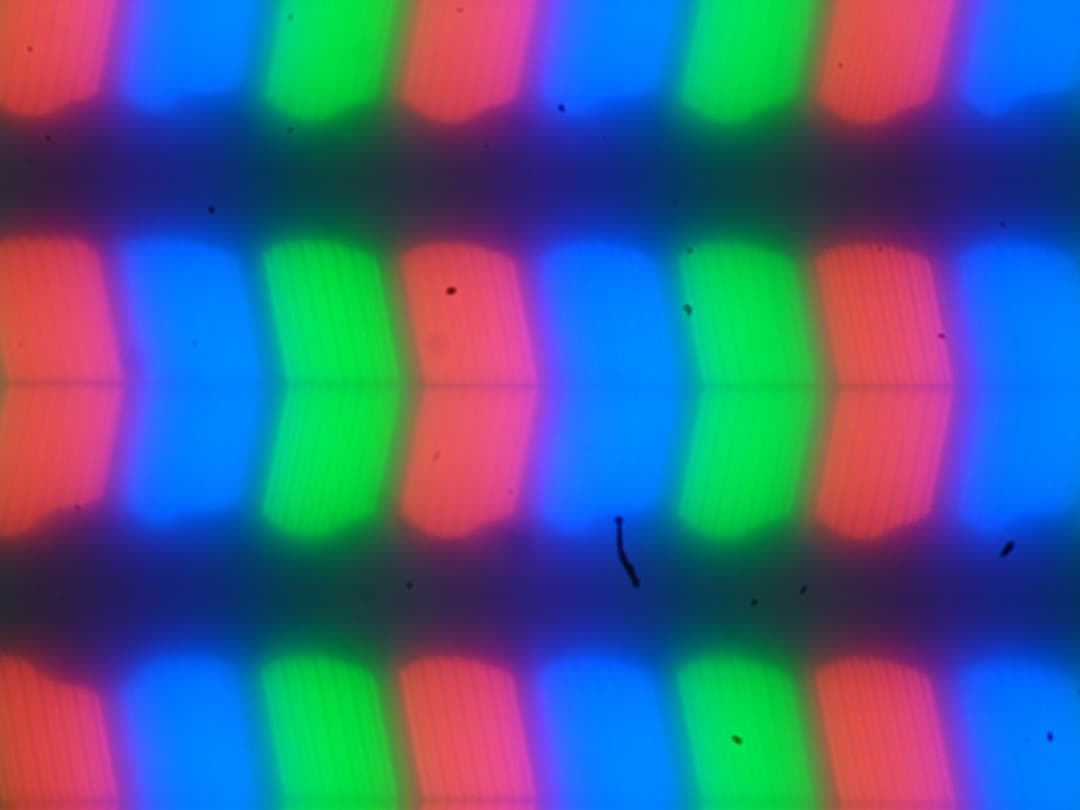 На микрофотографии ниже можно разглядеть типичную для IPS структуру в виде параллельных полосок, а также, что каждый субпиксель делится на два примерно равных домена (черные точки — это пыль на матрице фотоаппарата):