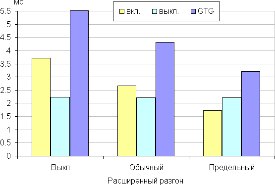 Время отклика зависит от значения настройки Расширенный разгон, которая управляет разгоном матрицы. Ступени регулировки три. График ниже показывает, как меняется время включения и выключения при переходе черный-белый-черный (столбики «вкл.» и «выкл.»), а также среднее суммарное время для переходов между полутонами (столбики GTG):