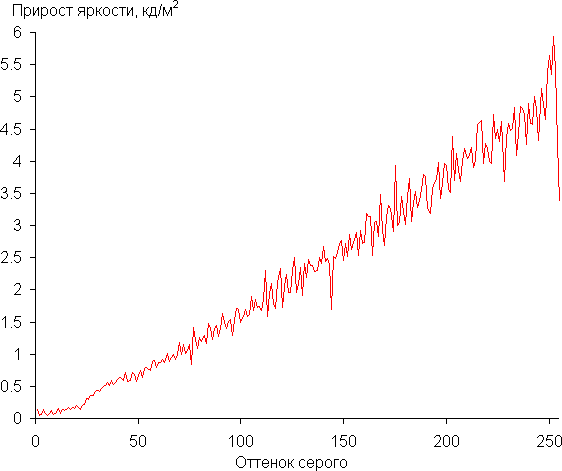 Реальная гамма-кривая ближе всего к стандартной при выборе варианта Гамма = 2.4, поэтому далее мы измерили яркость 256 оттенков серого (от 0, 0, 0 до 255, 255, 255) при этом значении. График ниже показывает прирост (не абсолютное значение!) яркости между соседними полутонами: