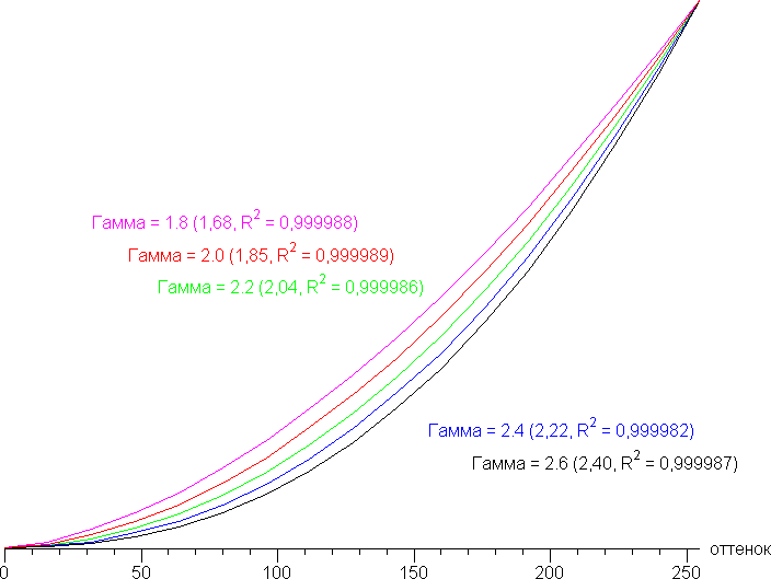 Реальная гамма-кривая зависит от выбранного значения в списке Гамма (значения показателей аппроксимирующей функции приведены в скобках в подписях, там же — коэффициент детерминации):