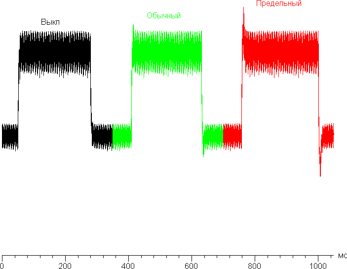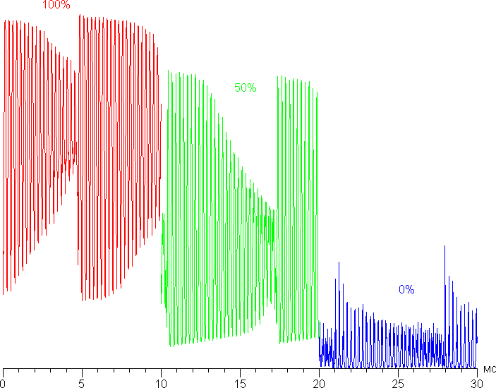 Яркость монитора меняется именно яркостью подсветки, то есть без ущерба для качества изображения (сохраняется контрастность и количество различимых градаций) яркость монитора можно менять в очень широких пределах, что позволяет с комфортом работать и смотреть фильмы как в освещенном, так и в темном помещении. По всей видимости, яркость светодиодов регулируется не без помощи ШИМ, но частота модуляции очень высокая — порядка 4 кГц — и фаза модуляции как-то распределяется по зонам. Поэтому никакого видимого мерцания нет, также наличие модуляции не выявляется в тесте на присутствие стробоскопического эффекта. Приведем графики зависимости яркости (вертикальная ось) от времени (горизонтальная ось) при различных значениях настройки яркости (замер в области порядка 1 см²):