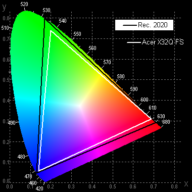 Исходный цветовой охват гораздо шире sRGB (100% покрытие и 178% объема), по объему шире DCI-P3 (96% покрытие и 126% объема) и даже приближается к Rec. 2020: