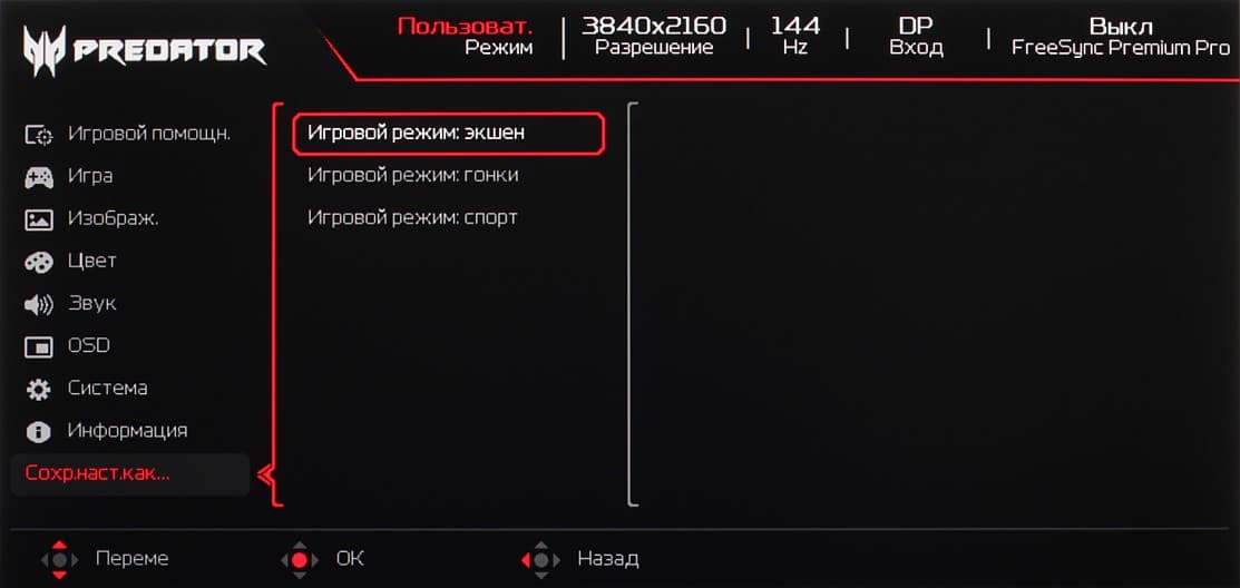 Есть четыре встроенных профиля и один пользовательский, в котором можно настраивать все, а три набора значений настроек можно сохранить в трех игровых профилях: